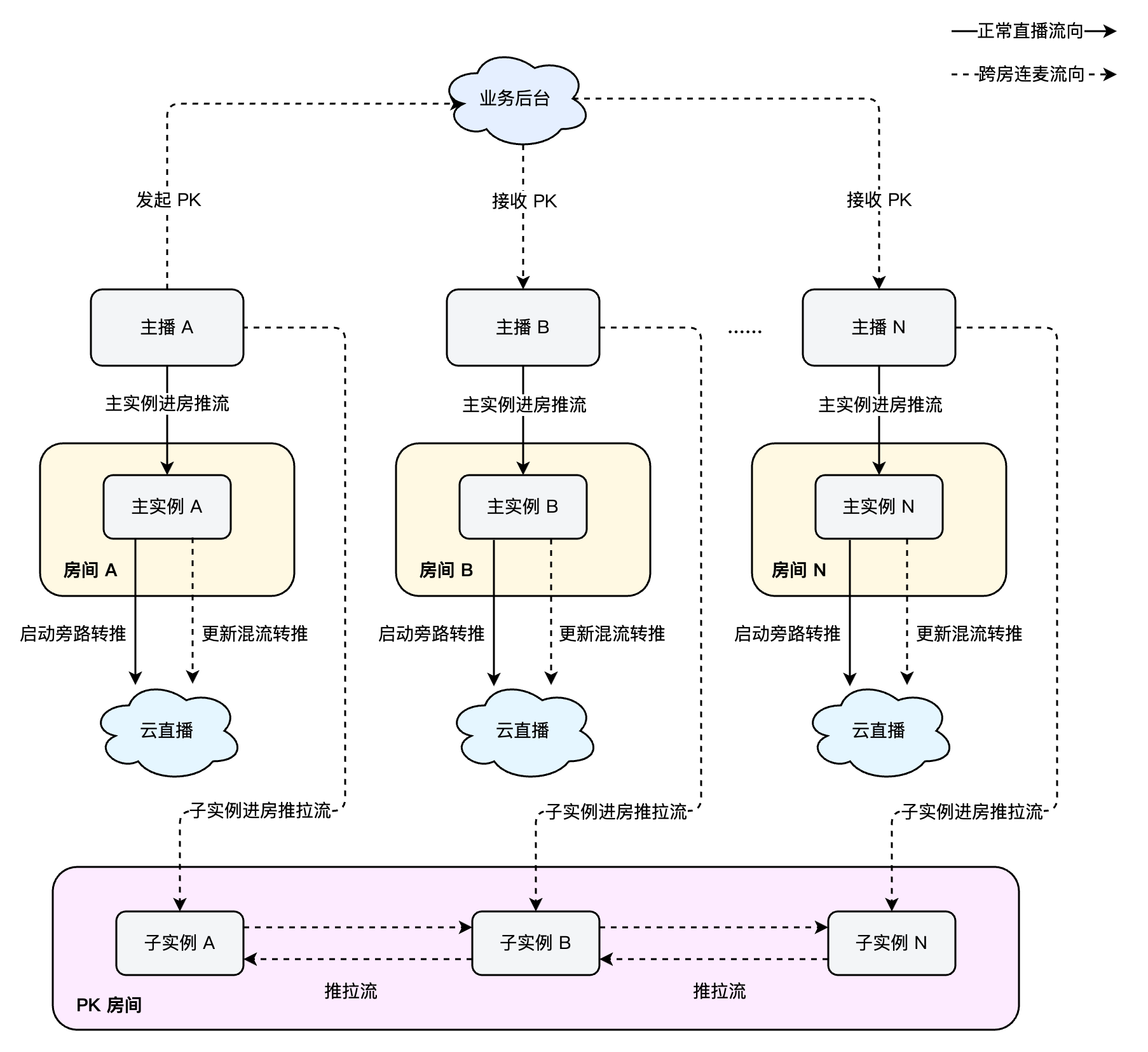 4. 主播 A、主播 B、主播 N 分别创建一个子实例,进入一个新的 PK 房间进行推拉流。