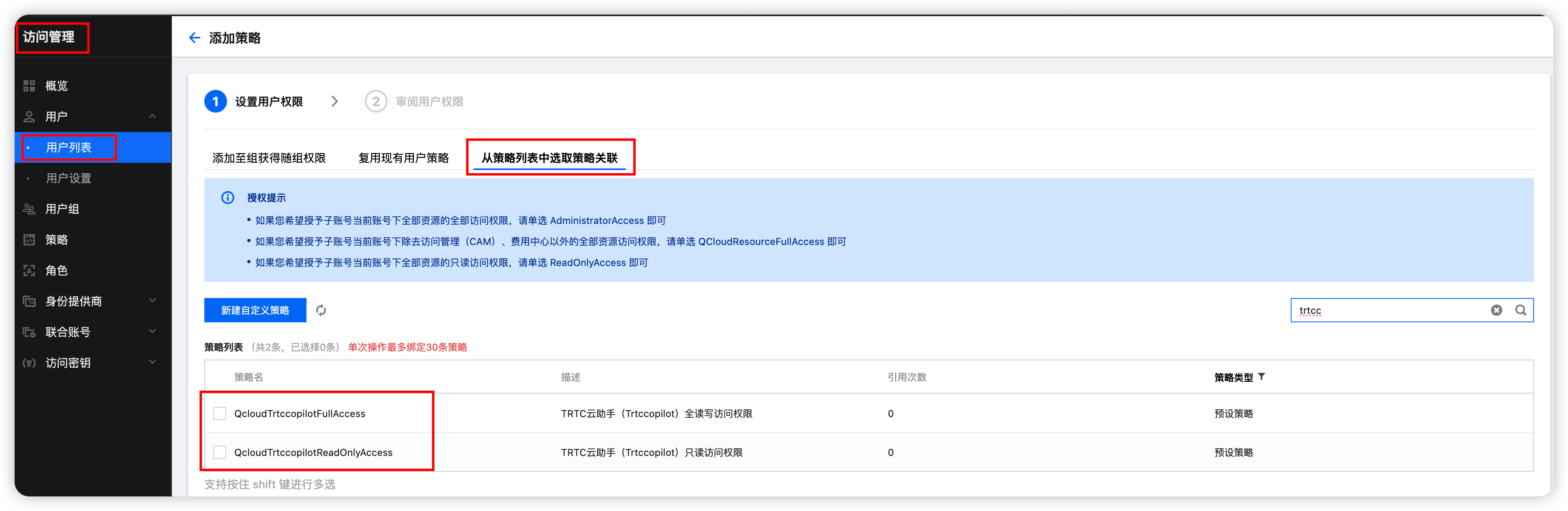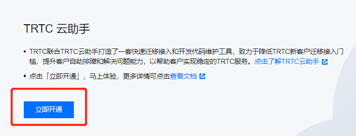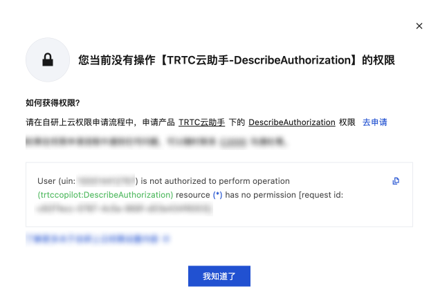 当您是使用子账号访问,可能会出现弹框提示您当前没有操作【TRTC 云助手-DescribeAuthorization】的权限,您可根据弹框中的提示指引,进行权限申请,权限申请完成后即可正常访问。