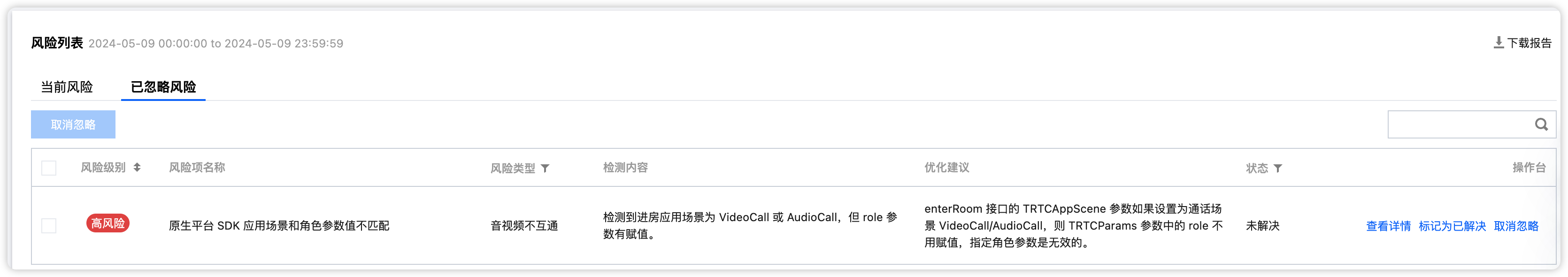 点击忽略该风险,风险会被忽略,并出现在已忽略风险列表中。您也可以点击取消忽略,重新回到当前风险列表。