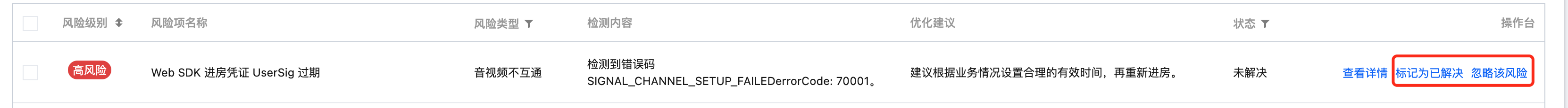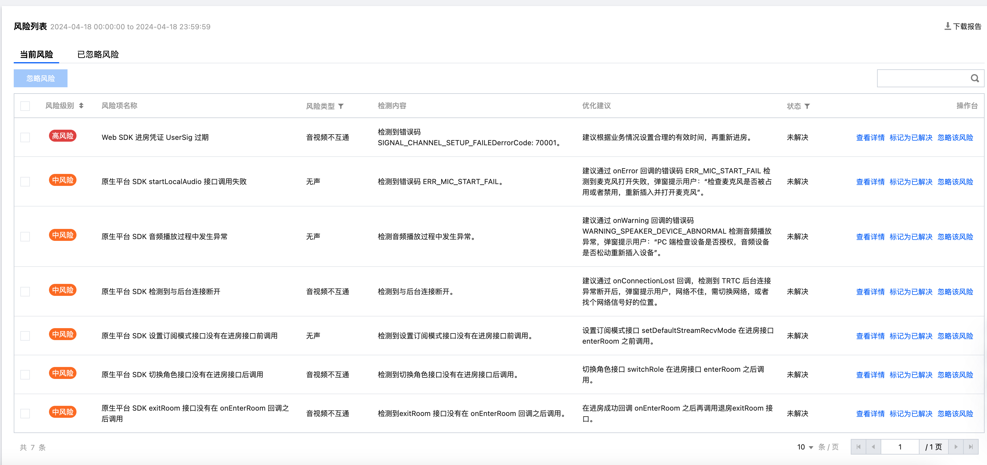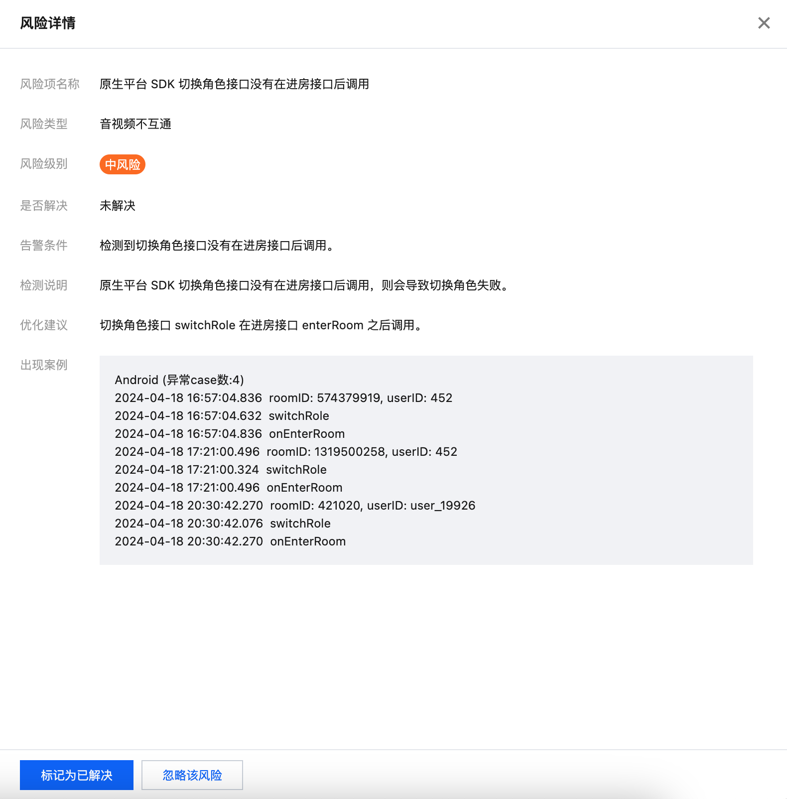 点击查看详情,可查看对应风险的详细信息。风险详情提供了风险项的详细信息,点击包括案例发生的时间点、房间号和用户 ID,方便您追溯业务调用代码,从而提高解决问题的效率。