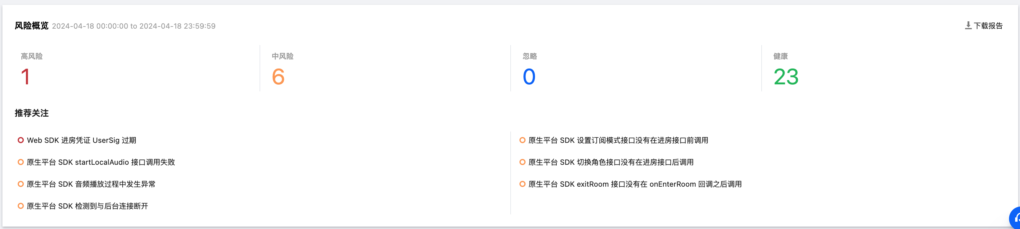在您的应用准备上线前,云端巡检能够全面分析 TRTC 的使用情况,识别潜在风险,并提供针对性的优化建议,帮助您确保业务在上线前的稳定性。