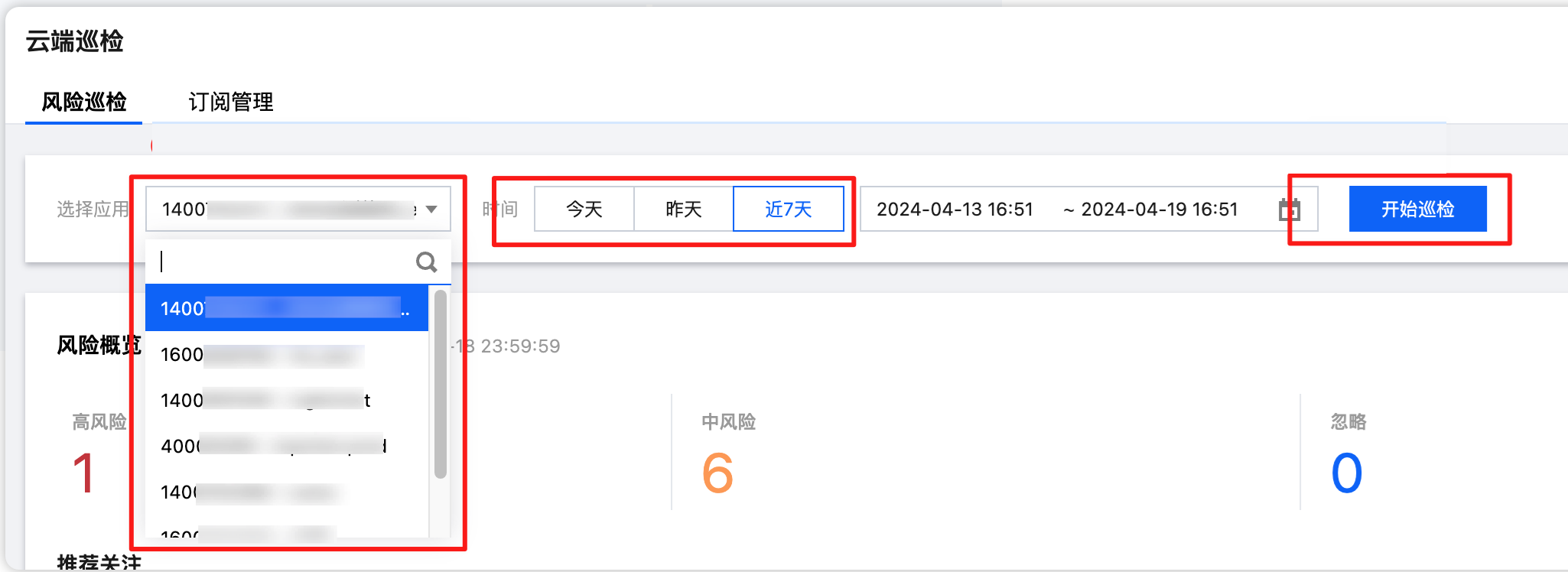 在左侧导航栏中,选择云端巡检 > 风险巡检,然后选择需要巡检的应用和巡检的时间范围,点击开始巡检,即可发起巡检。
