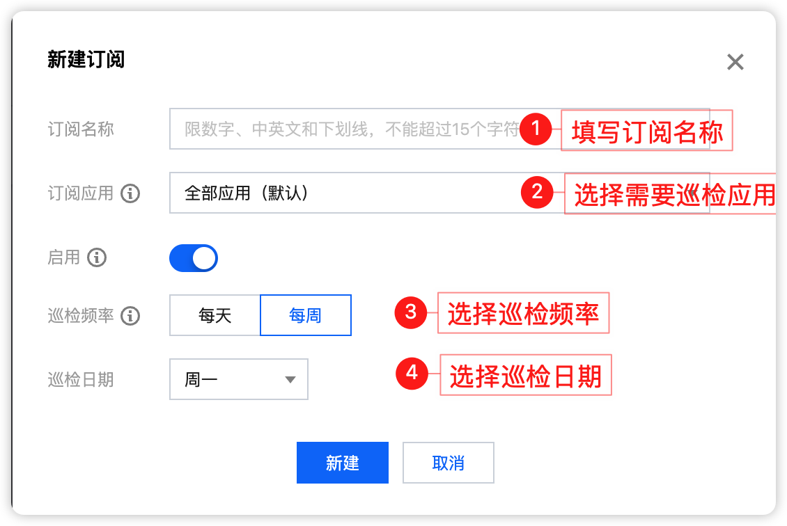点击云端巡检 > 订阅管理, 在订阅管理页面点击新建订阅创建订阅规则。订阅巡检会定期检查您订阅的应用,并将结果更新至控制台上,以便您更好地了解使用 TRTC 的情况。