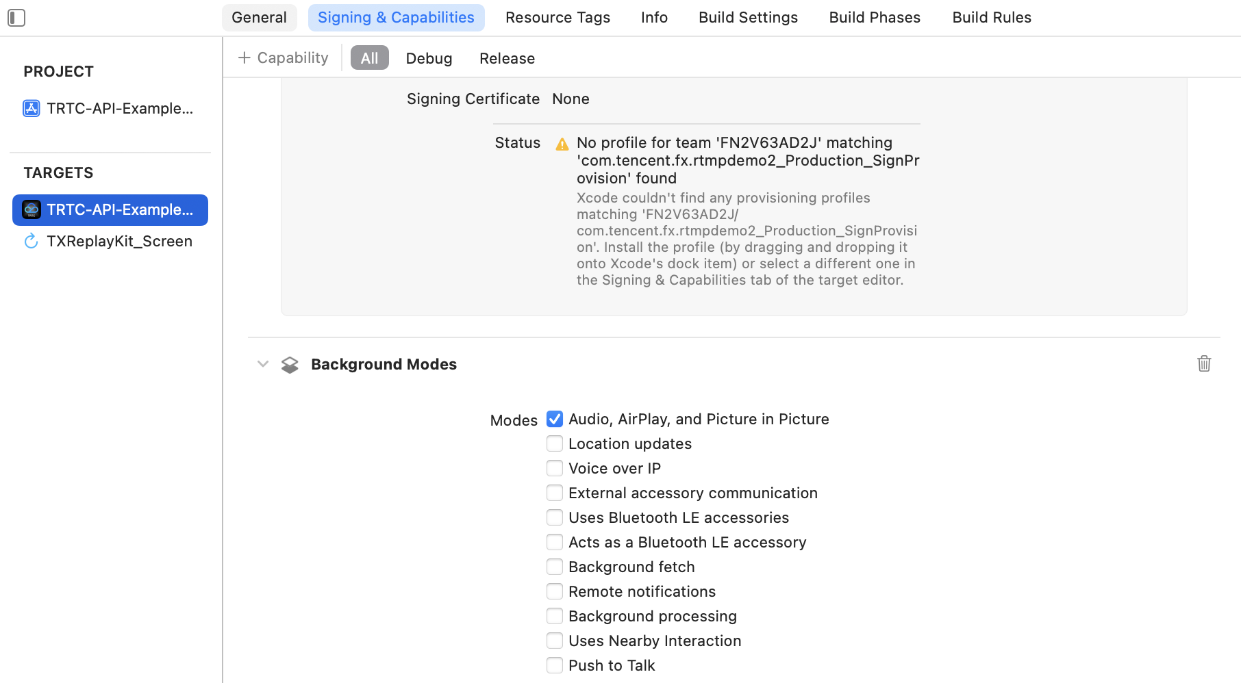 5. 找到 Background Modes 选项,勾选 Audio, AirPlay, and Picture in Picture 模式。