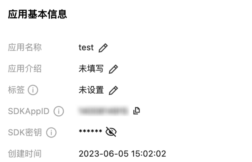 2. 应用创建完毕之后,您可以在 应用管理 > 应用概览中看到该应用的基本信息,其中需要您保管好 SDKAppID、SDK 密钥(SDKSecretKey)便于后续使用,同时应避免密钥泄露造成流量盗刷。