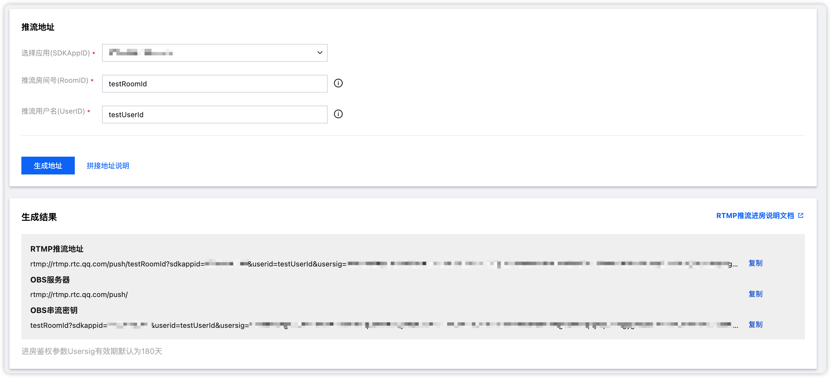 1. 通过 RTMP 推流生成器 生成 RTMP 推流地址。