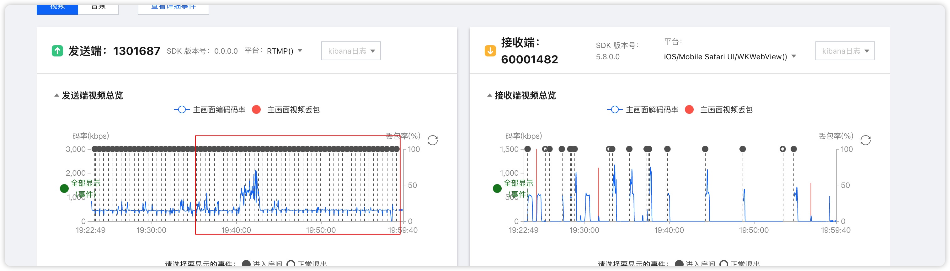 在娃娃机场景中,当 TRTC 观众进入房间并拉流一段时间后,便会自动遇到拉流卡住问题,尤其在多次触发 peer-join 或 onUserVideoAvailable 回调后,观众拉流的画面会停留在最后一帧不动。遇到这种情况时,可以首先访问仪表盘查看详细的通话信息。如果仪表盘显示的特征表明主播多次进出房间,那么可以基本确认问题是由于互踢导致的,仪表盘特征如下。