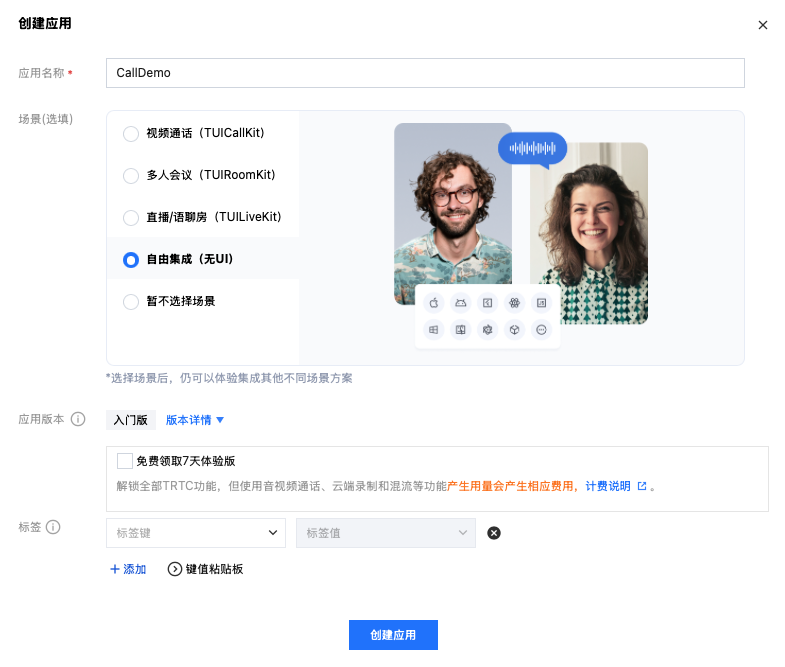 1. 首先您需要登录 实时音视频 TRTC 控制台 创建应用,此时在 即时通信 IM 控制台 会同步自动创建一个与当前 TRTC 应用相同 SDKAppID 的 IM 体验版应用,二者账号与鉴权体系可复用。后续您可根据需要选择升级 TRTC 或 IM 应用版本,例如旗舰版可解锁更多增值功能服务。