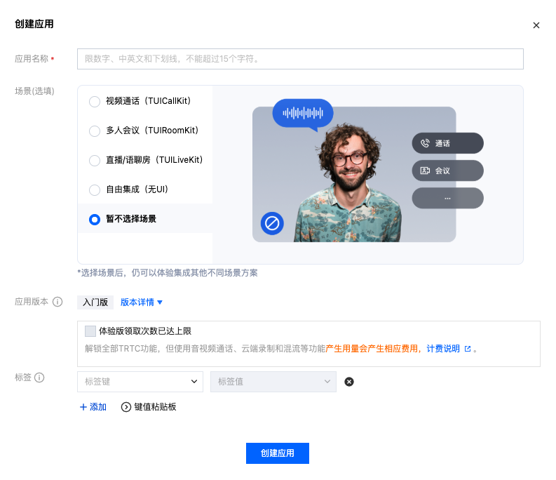 1. 首先,您需要登录 实时音视频 TRTC 控制台 > 应用管理 创建应用,您可根据需要选择升级 TRTC 应用版本,例如旗舰版可解锁更多增值功能服务。