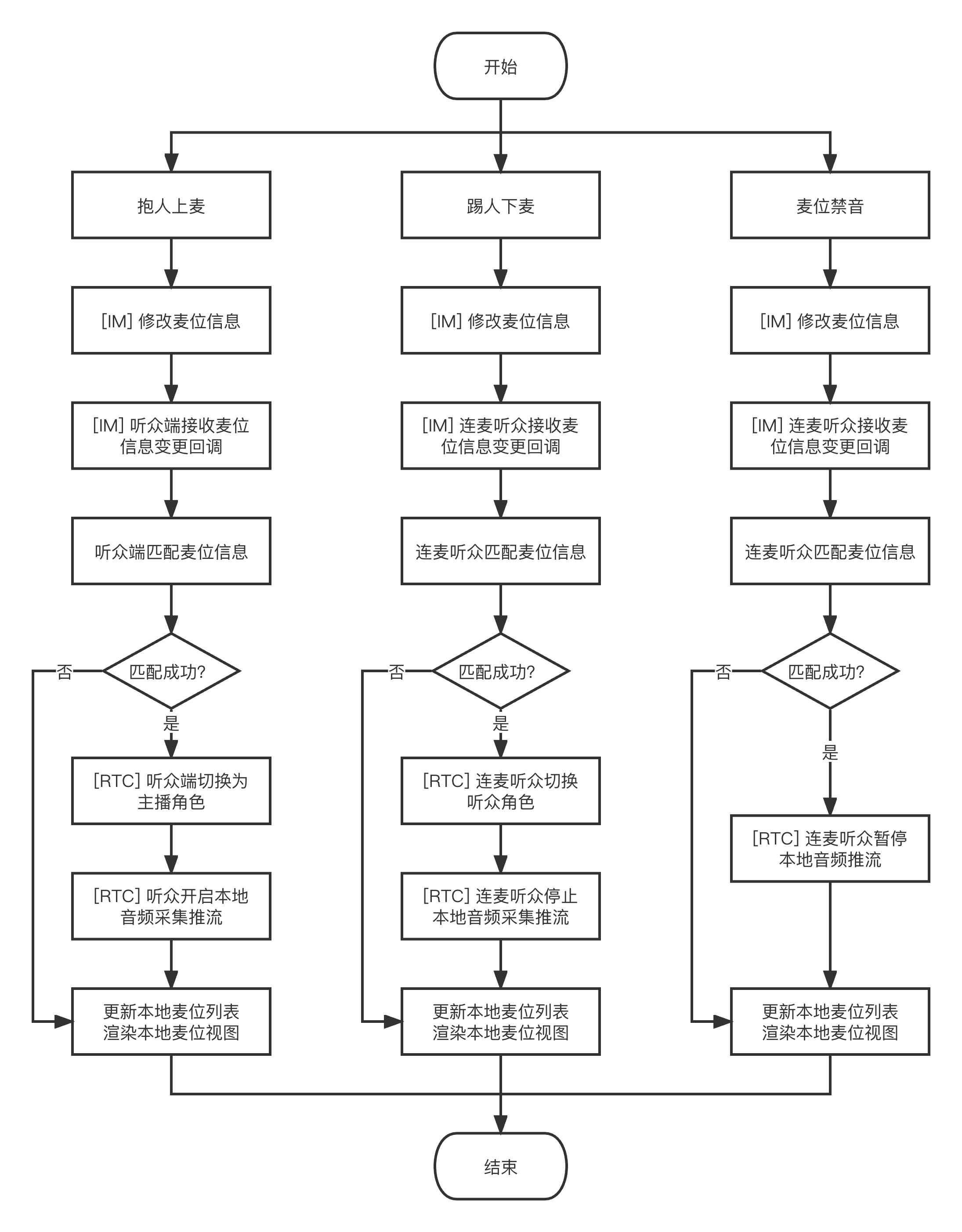 下图展示了听众麦位管理流程,包含主动上麦、主动下麦、麦位移动的实现流程。