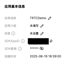 2. 创建应用完毕之后,您可以在应用管理 > 应用概览栏目看到该应用的基本信息,其中需要您保管好 SDKAppID、SDK 密钥便于后续使用,同时应避免密钥泄露造成流量盗刷。