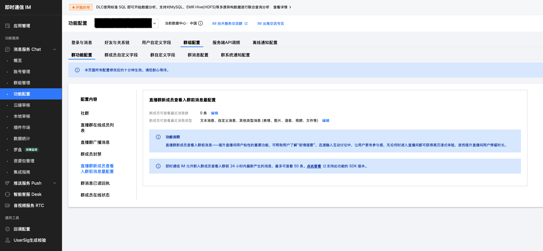 使用 AVChatRoom 默认不存储直播间历史消息,当新用户进入直播间后,只能看到进入直播间后用户发送的消息。为了优化新进群用户的体验,可在 即时通信 IM 控制台 配置直播群新成员查看入群前消息量,如下图所示: