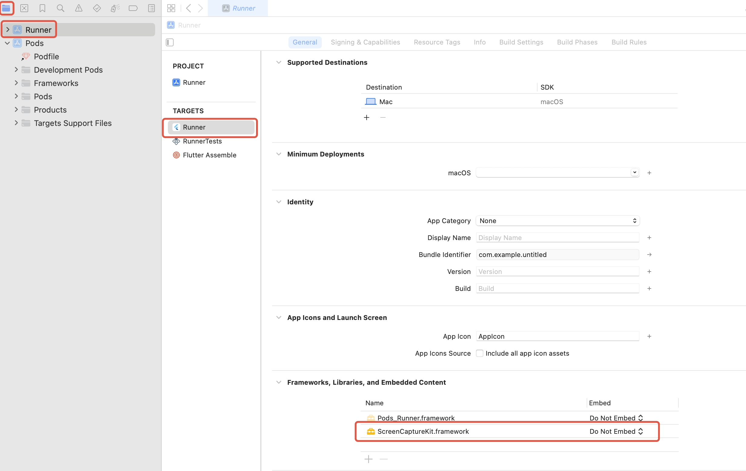 2. 在 General 选项卡的 Frameworks, Libraries, and Embedded Content 部分添加 ScreenCaptureKit.framework。