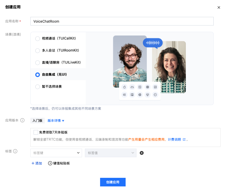 建议创建两个应用分别用于测试环境和生产环境,首次开通 TRTC 服务可前往 试用中心 免费领取10000分钟试用时长包。