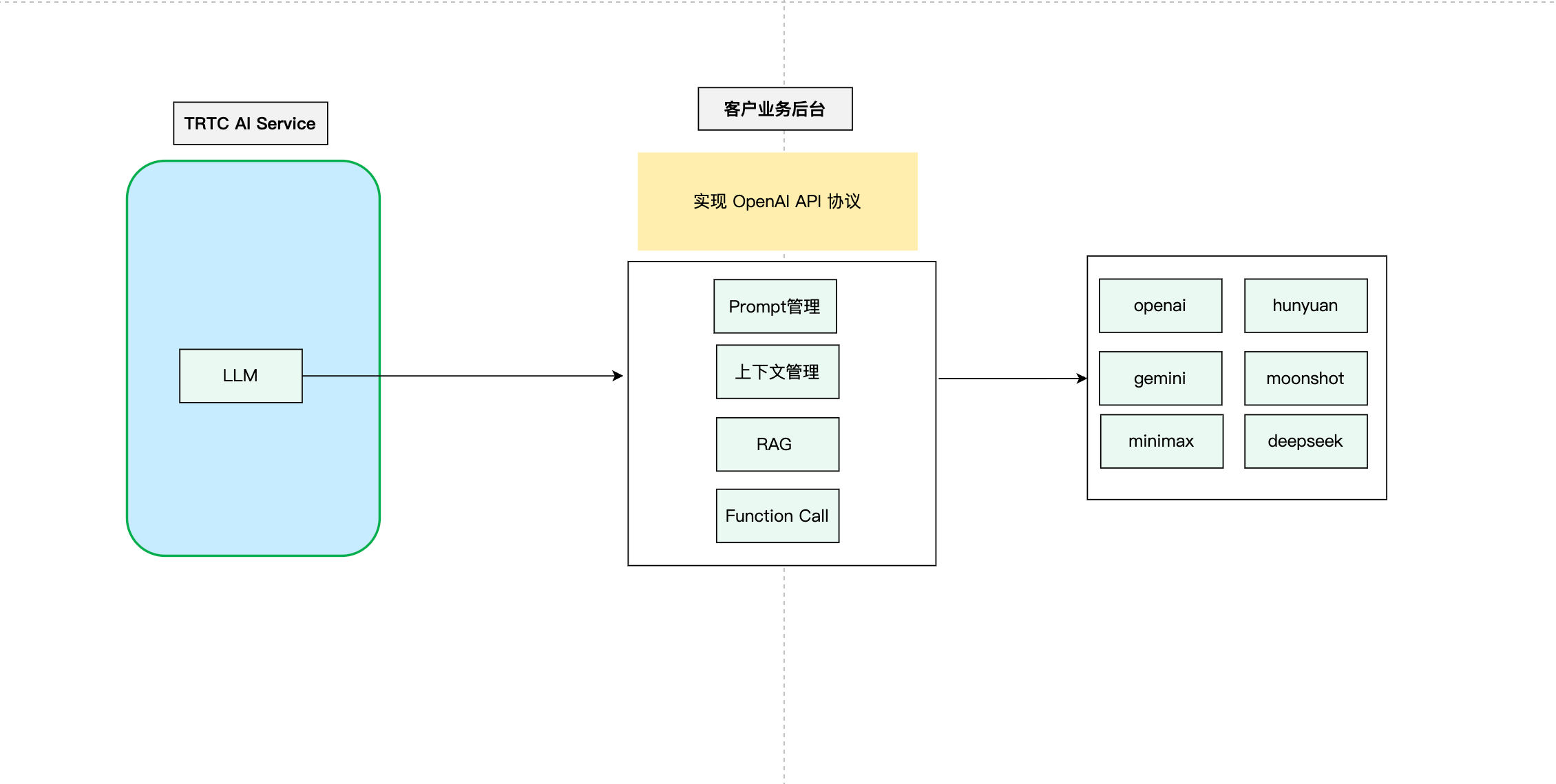 TRTC AI 实时对话支持任何符合 OpenAI 标准协议的 LLM 模型,也支持腾讯云智能体开发平台、Dify、Coze 等 LLM 应用开发平台,具体支持的平台可参见 LLMConfig 配置说明。