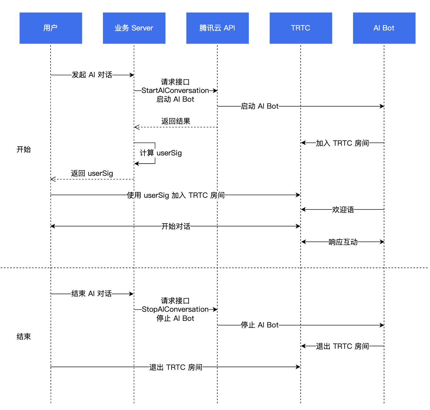 通过业务后台调用 开始 AI 对话任务 接口,来发起 AI 实时对话,调用成功后,AI 机器人会进入 TRTC 房间。将 前提条件 中的 LLM 和 TTS 相关信息填入