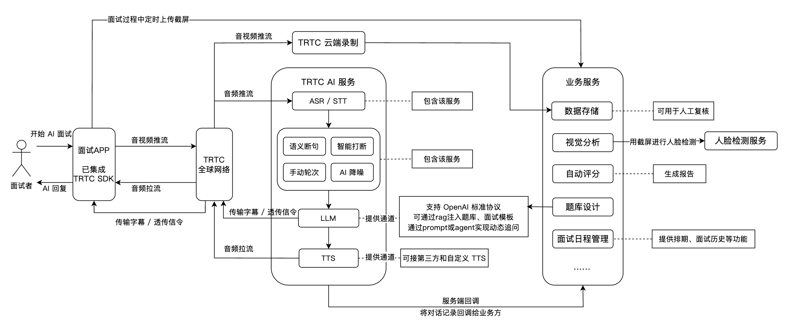 AI 面试是一种利用人工智能技术和高质量实时音视频通信实现在线自动化面试的新型方案。在传统面试过程中,受限于面试官数量、时间安排和主观评价等因素,企业在大规模招聘、人才筛选环节容易遇到效率低、成本高、体验不佳的问题。借助 AI 实时对话能力,AI 面试可以为企业和求职者提供24小时可用、标准化且高效的在线面试体验。AI 面试官基于大语言模型(LLM),能够与应聘者进行自然对话,实时提问、追问,考察应聘者的综合能力,并根据面试内容自动记录和整理文本数据,为后续评估提供支持。