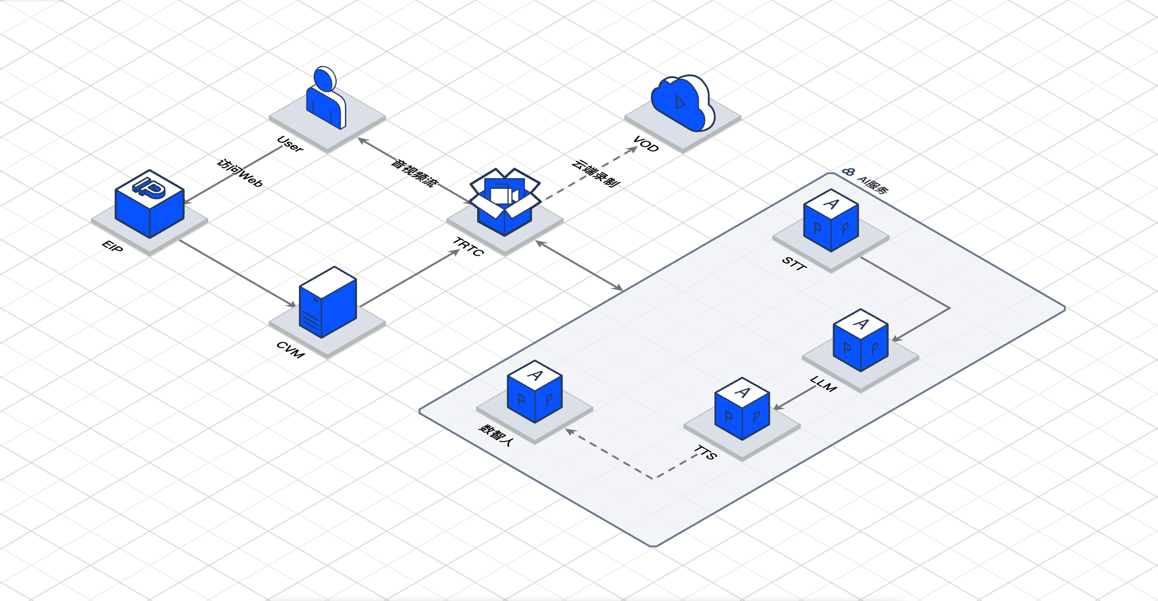 所有能力以 API 方式服务化,并由 TRTC 实时对话进行调度,形成完整的「听 → 想 → 说」闭环。