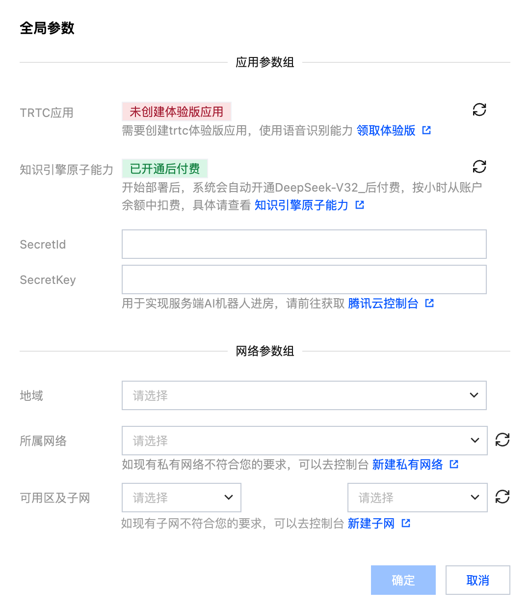 建议:如已有 TRTC 应用,可直接选择使用已有资源,同时 领取体验版 或购买 AI 智能识别套餐包,以体验 AI 实时对话功能。
