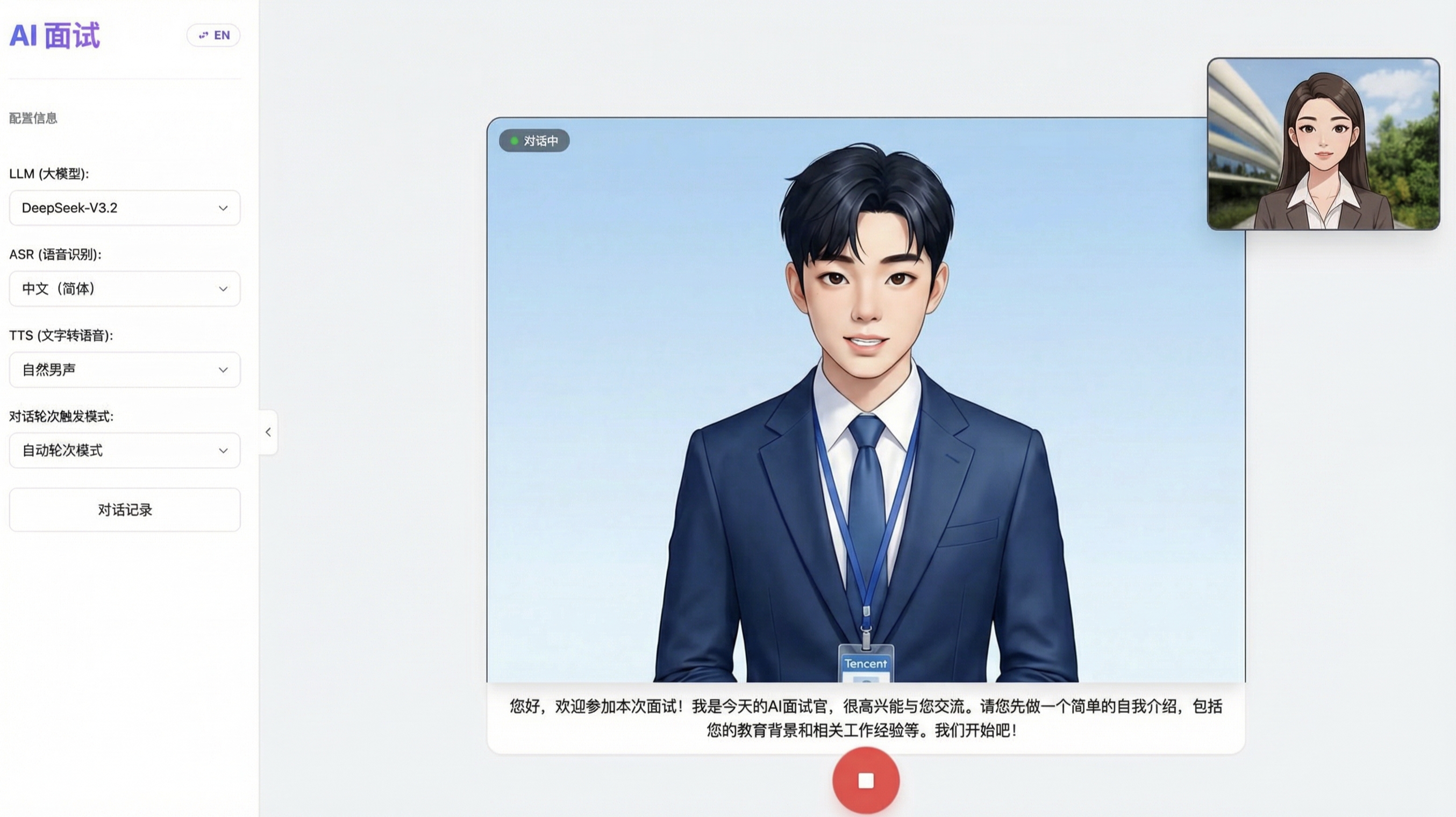 AI 面试官基于实时音视频 TRTC 与人工智能 AI 技术构建,通过语音或视频形式,他可以与候选人进行实时对话,围绕既定岗位模型进行提问、追问与总结,并自动生成结构化面试结果,用于后续人工评估与决策。本方案支持分钟级快速部署专属“AI 面试官”,可承担初轮面试任务,显著降低招聘前期的人力成本。