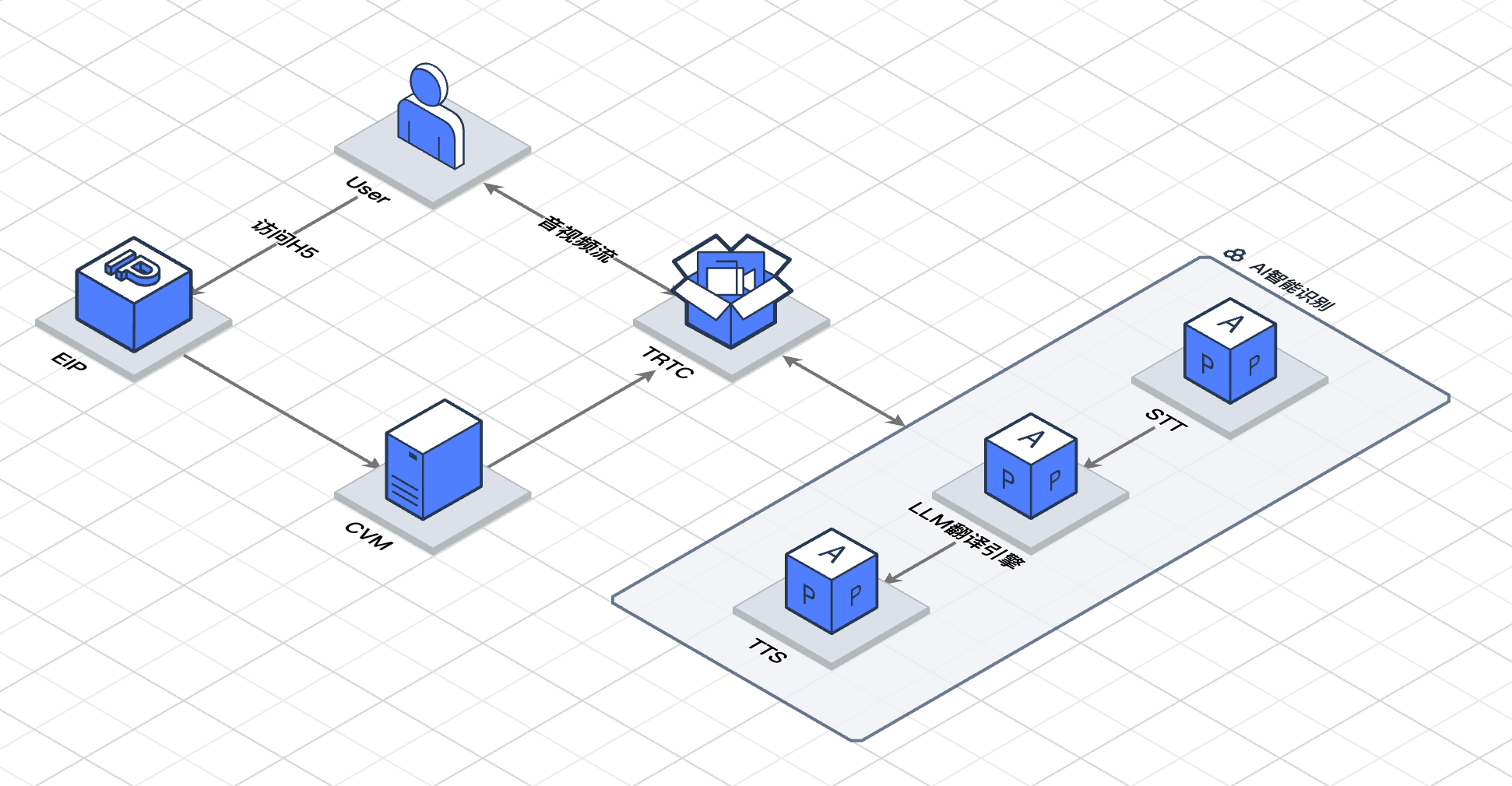 所有能力以 API 方式服务化,并由 TRTC AI 服务层进行调度,形成完整的「听 → 翻译 → 说」闭环。