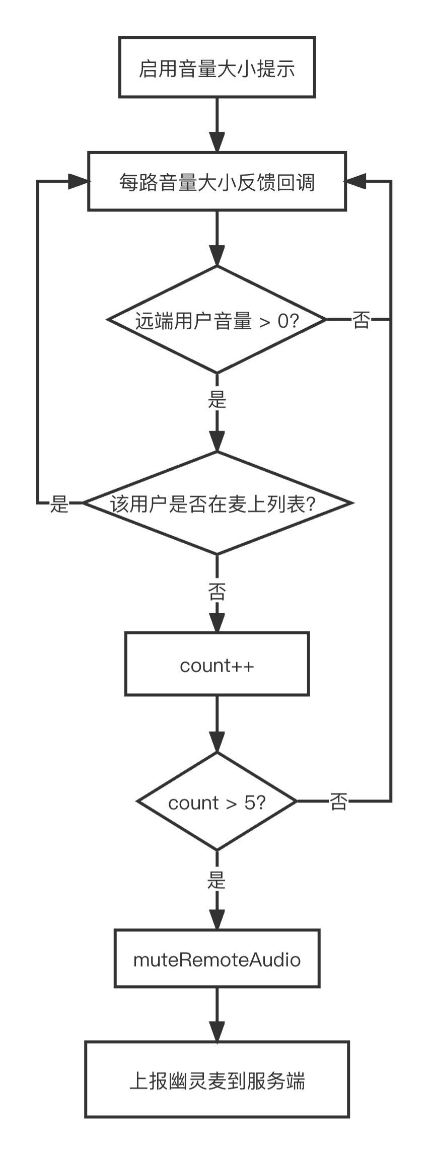方案原理:通过 TRTC 音量大小回调,比对当前上行音频用户列表和业务麦位状态列表,从而识别出不在麦上却有音频上行的幽灵麦,流程如下图所示。