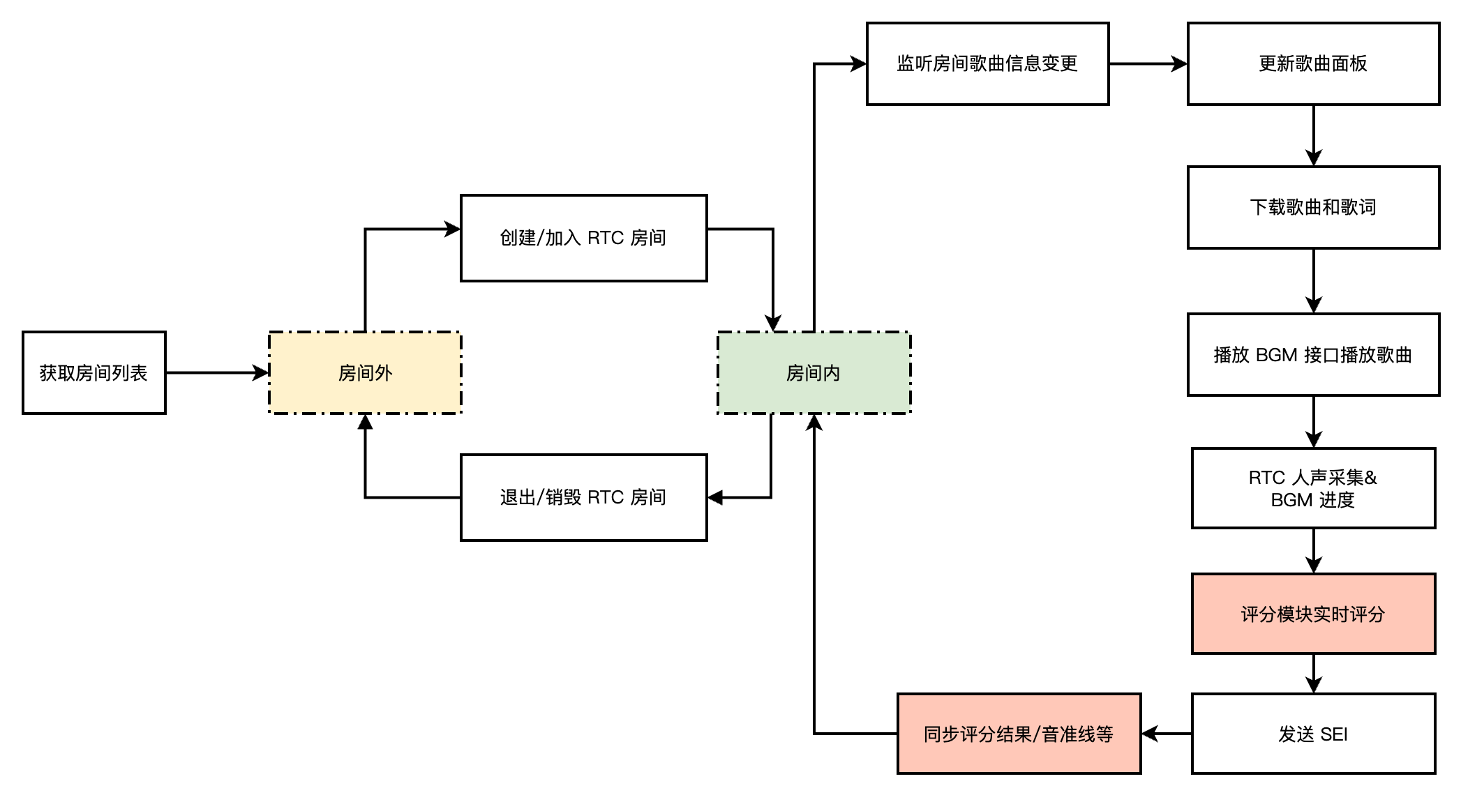 在线 K 歌场景整体的业务流程如下图所示。房主创建 K 歌房,用户可以选择感兴趣的歌房加入。进入房间后用户可以上麦参与互动,上麦后也可以选择自己喜欢的歌曲点歌并等待排麦,等排到的时候就可以跟着伴奏演唱。当然,用户也可以选择直接上麦参与合唱,这是两种不同的 K 歌玩法。演唱过程中会有针对单句演唱的音准评分,演唱结束后也会有针对整曲演唱的歌唱评分。