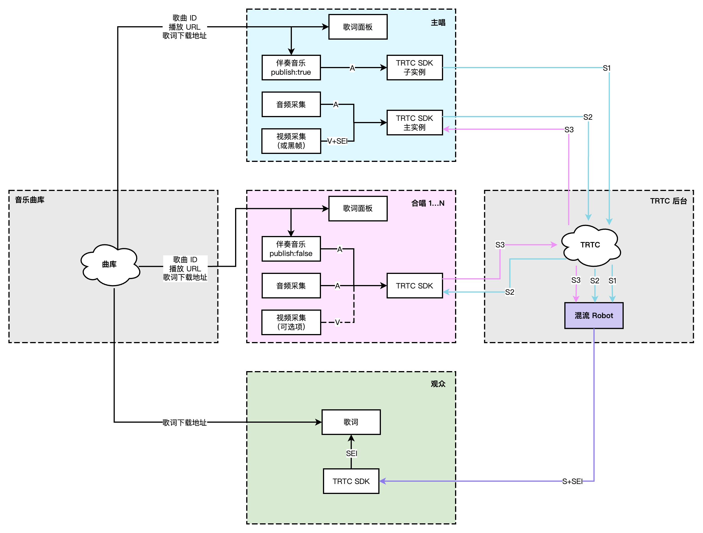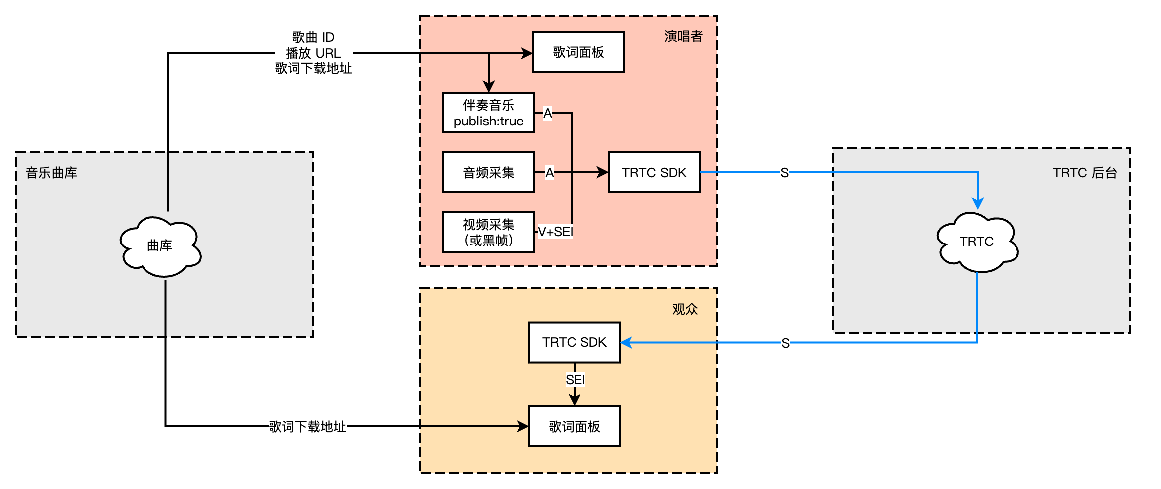 在整体方案中,主要使用音乐曲库来提供歌曲和歌词等资源,使用 TRTC 来实现演唱者人声的推流、歌曲伴奏的播放及推流。整体的方案架构如下: