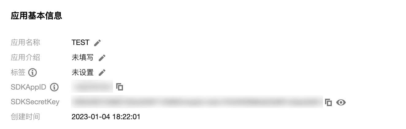 2. 应用创建完毕之后,您可以在应用管理 > 应用概览栏目看到该应用的基本信息,其中需要您保管好 SDKAppID、SDKSecretKey 便于后续使用,同时应避免密钥泄露造成流量盗刷。