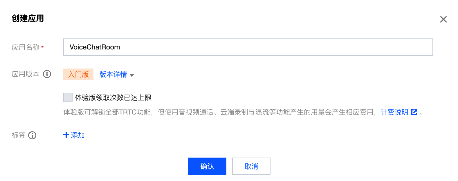 1. 首先,您需要登录 实时音视频 TRTC 控制台 创建应用,您可根据需要选择升级 TRTC 应用版本,例如旗舰版可解锁更多增值功能服务。