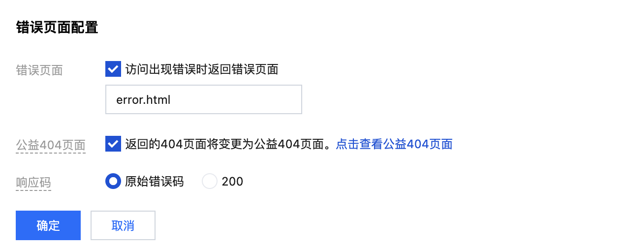 错误文档:错误文档指访问静态网站出错后返回的页面,用于自行定义错误文档。当静态网站无法响应用户的请求时,将返回指定的自定义错误页面。当您未配置错误文档时,用户访问遇到 HTTP 错误,页面将返回默认的错误信息。