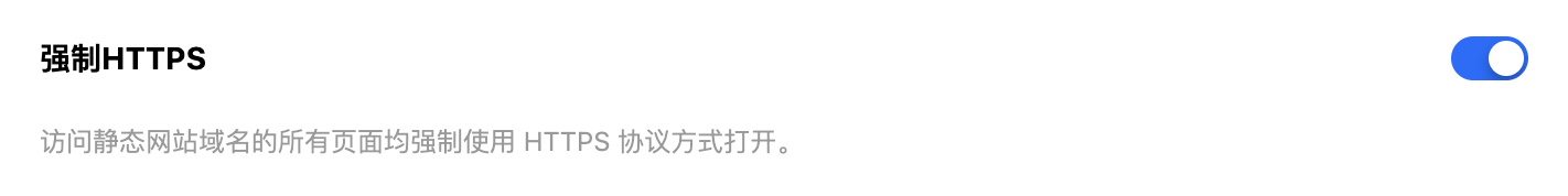 强制 HTTPS:当您开启强制 HTTPS 后,在用户访问自定义域名时,会强制使用 HTTPS 协议方式打开。