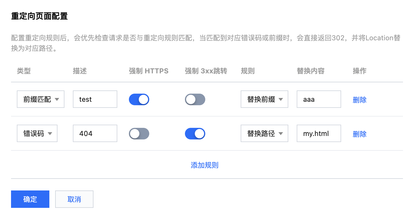 错误码:目前重定向规则仅支持对4xx错误码(例如404)进行重定向配置。您可以选择性地自定义错误页面,若用户触发了对应的 HTTP 错误,您可以在该错误页面中为您的用户提供其他指引。