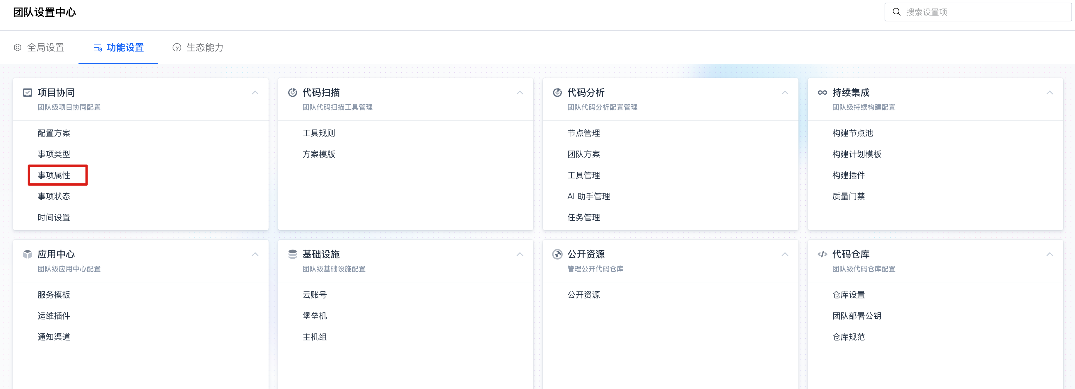 确认权限后,在团队设置中心,选择功能设置 > 项目协同 > 事项属性即可进入属性设置页面。