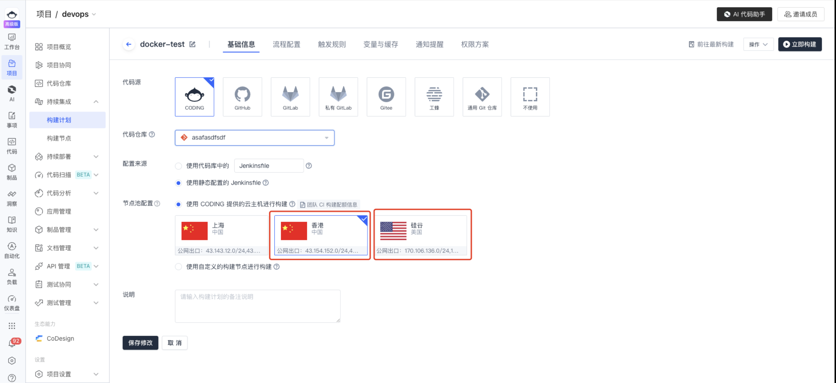 切换香港或硅谷为构建节点