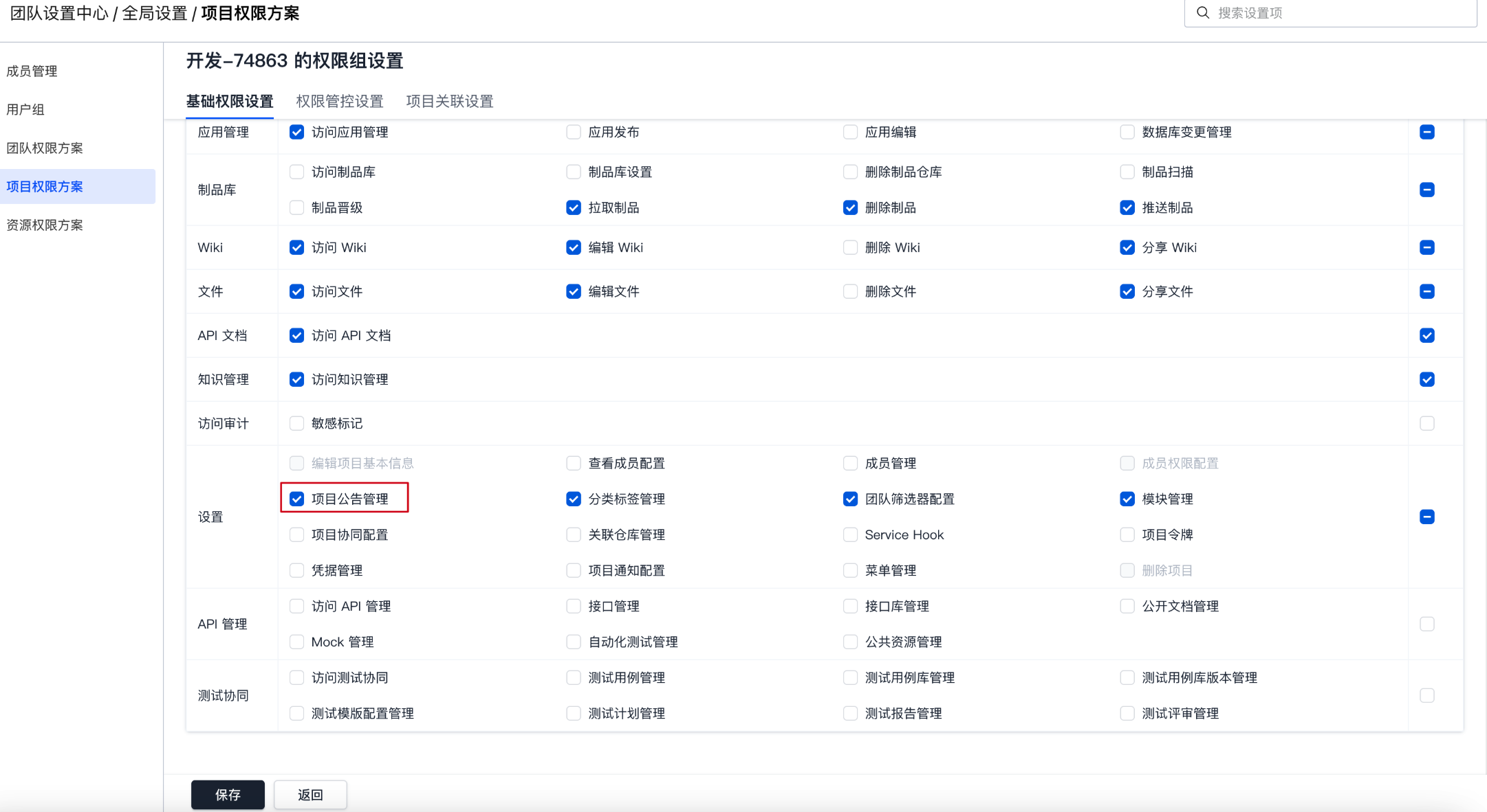 在团队设置中心 > 全局设置 > 项目权限方案的项目权限组中,可以开启或关闭项目公告管理功能,勾选功能权限后即可进行新建、编辑、删除项目公告操作。