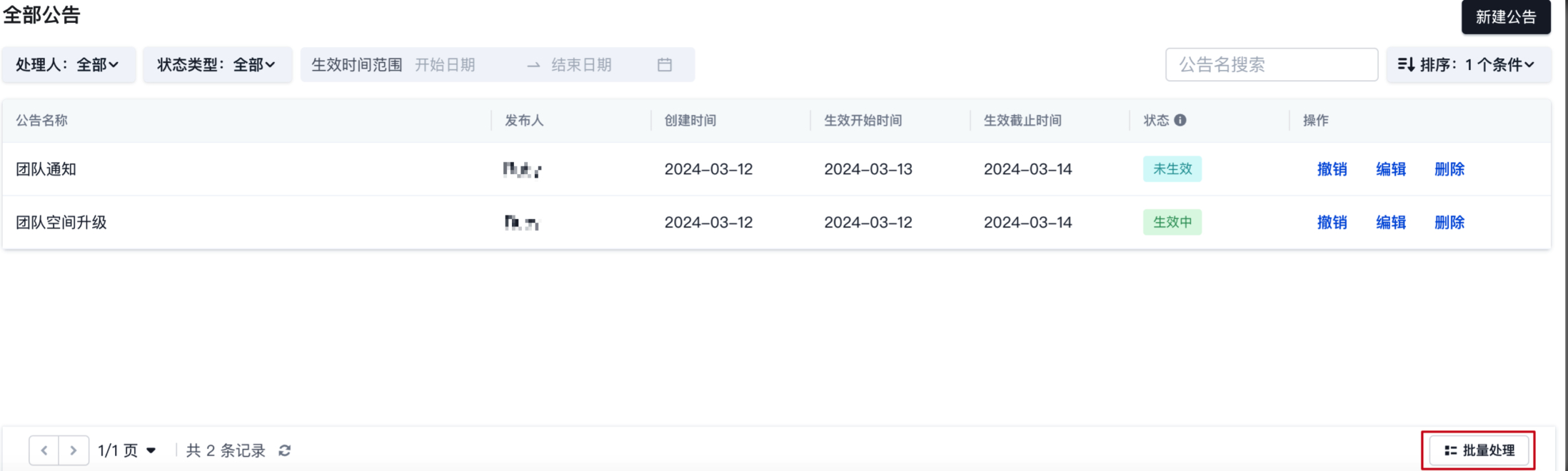 在公告列表右下角,单击批量处理,可以选中多个公告后批量删除团队公告。