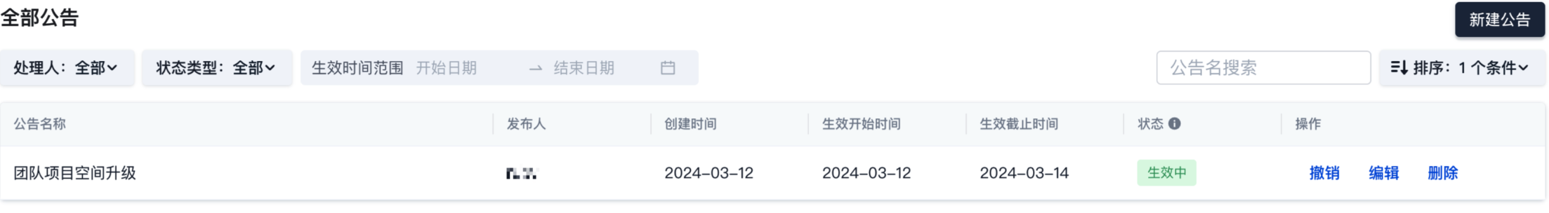 在公告列表中,单击对应公告后操作列的功能按钮,可以撤销、编辑或删除单个公告。
