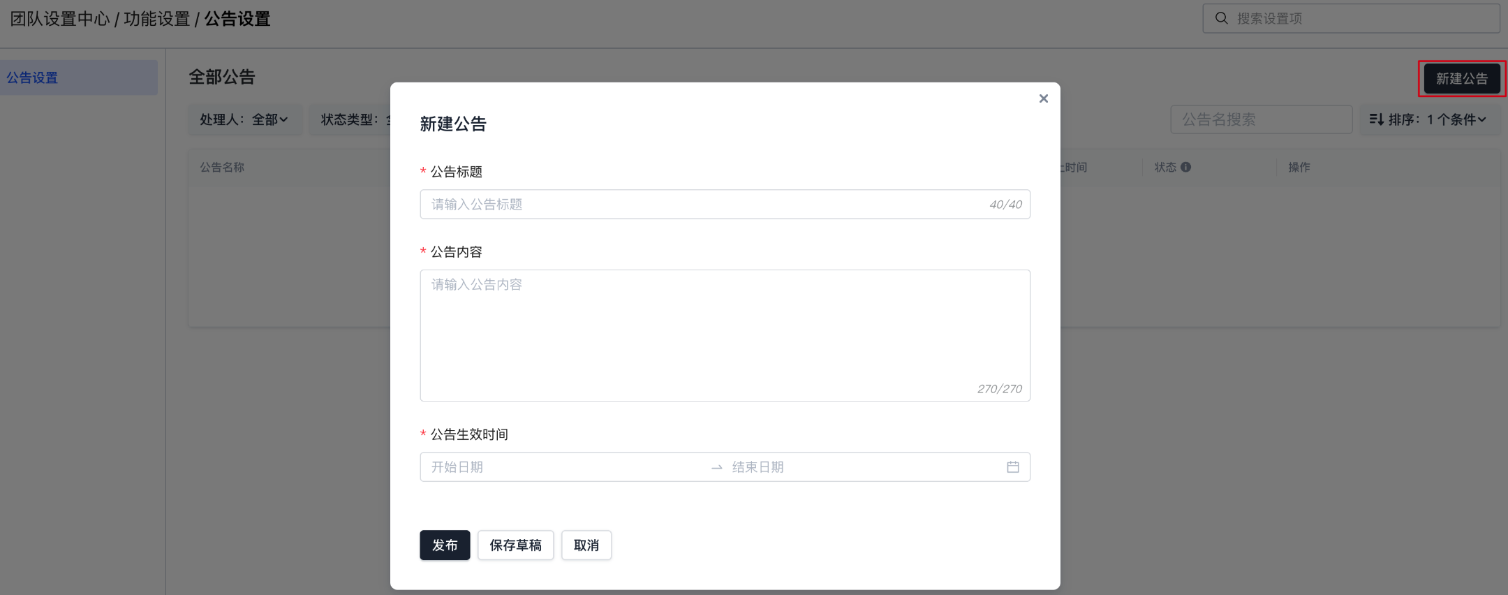 在新建公告页面填写公告标题、公告内容、生效时间后,单击发布。公告发布成功后,公告有效期内团队成员可以查看公告通知。