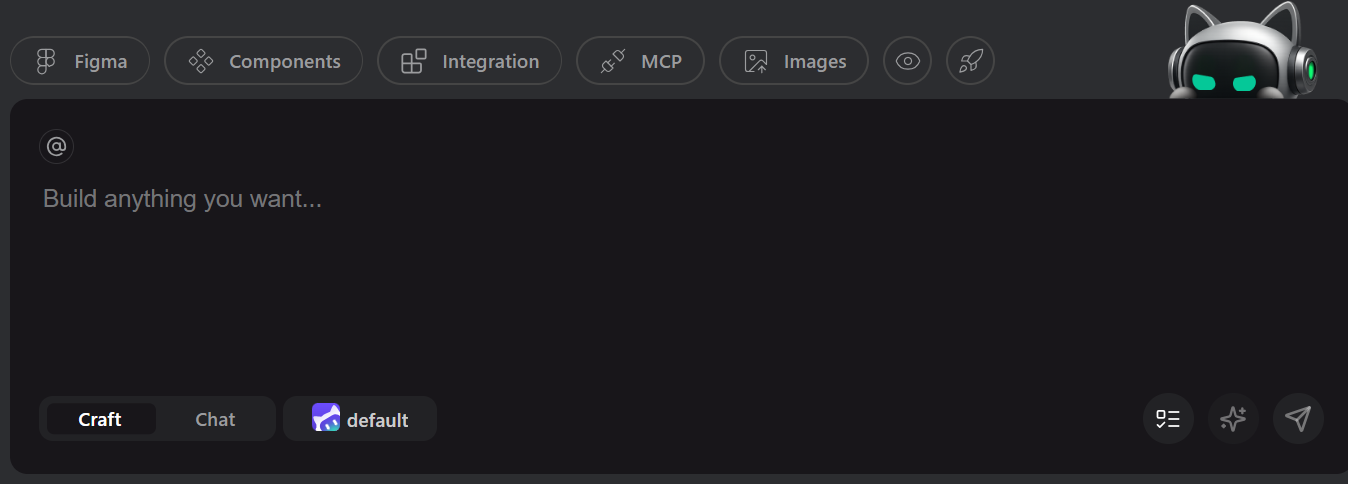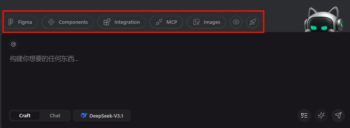 您可以通过自然语言与 Agent 进行对话,Agent 将根据您选择的对话模式(Chat/Craft)帮您提供解决方案,或自动帮您完成复杂编码任务。此外,您可以根据实际场景需求,合理使用内置的功能/工具,例如 Figma、Components、Integration、MCP 等等。