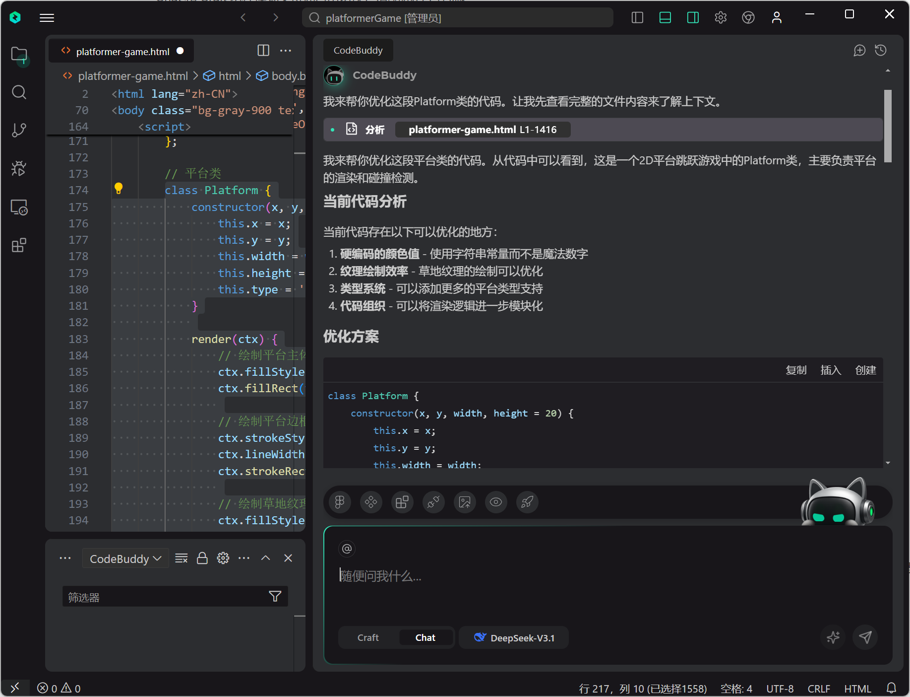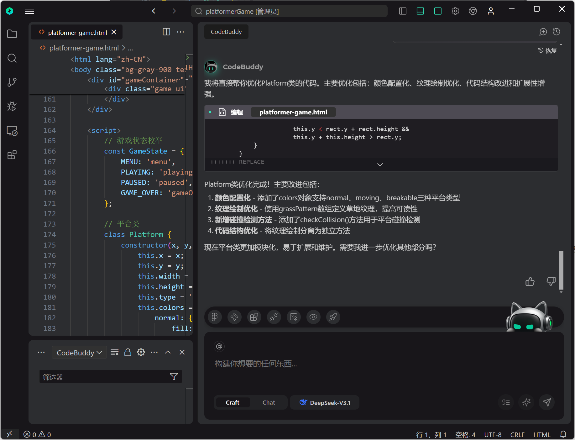 Craft 模式:Craft 模式是一个具有 “独立思考” 和 “自主执行” 的编程伙伴,通过自然语言指令,AI 深度理解需求,独立自主完成多文件代码编写与修改。