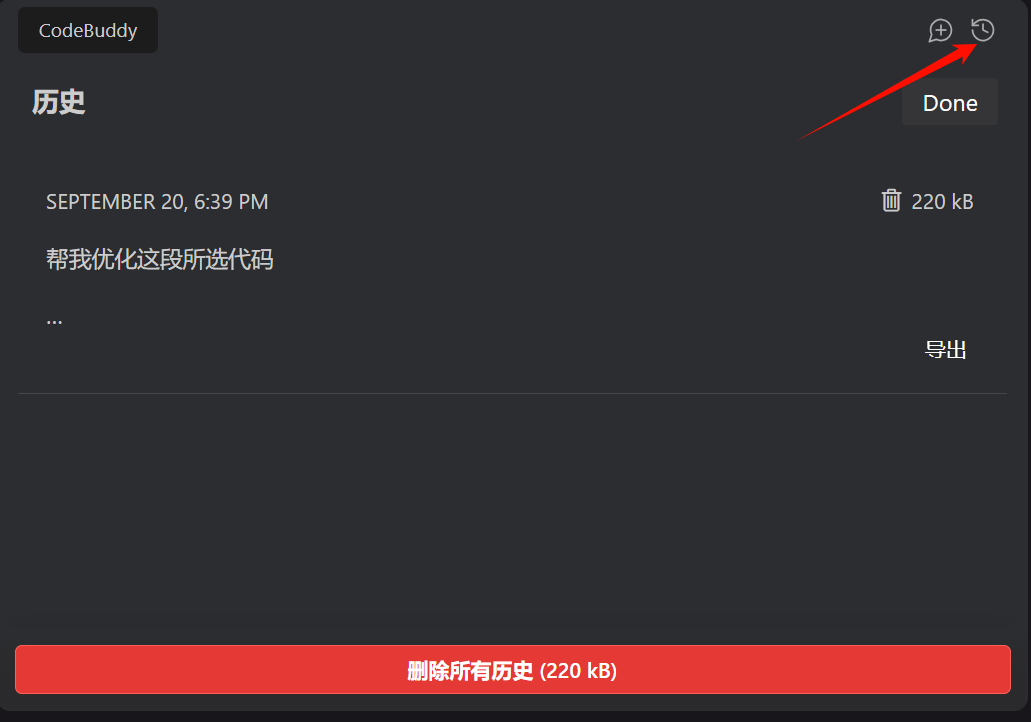 单击进入 History 按钮后,在这里,您可以查看或切换历史对话记录,并支持对历史对话记录进行删除和导出的操作。