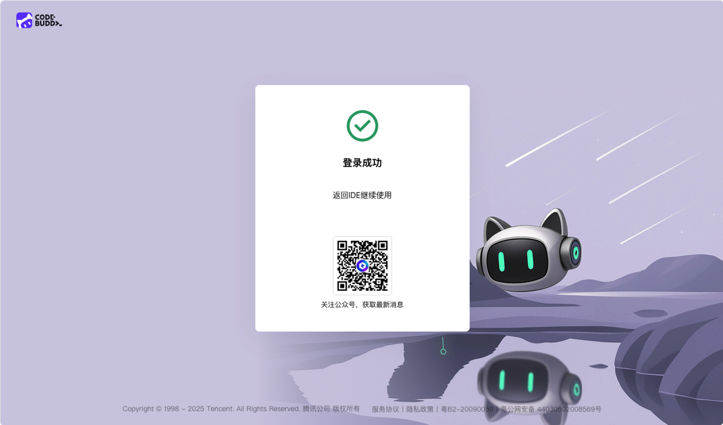 4. 登录成功后,将自动重定向回 CodeBuddy,获取登录状态。
