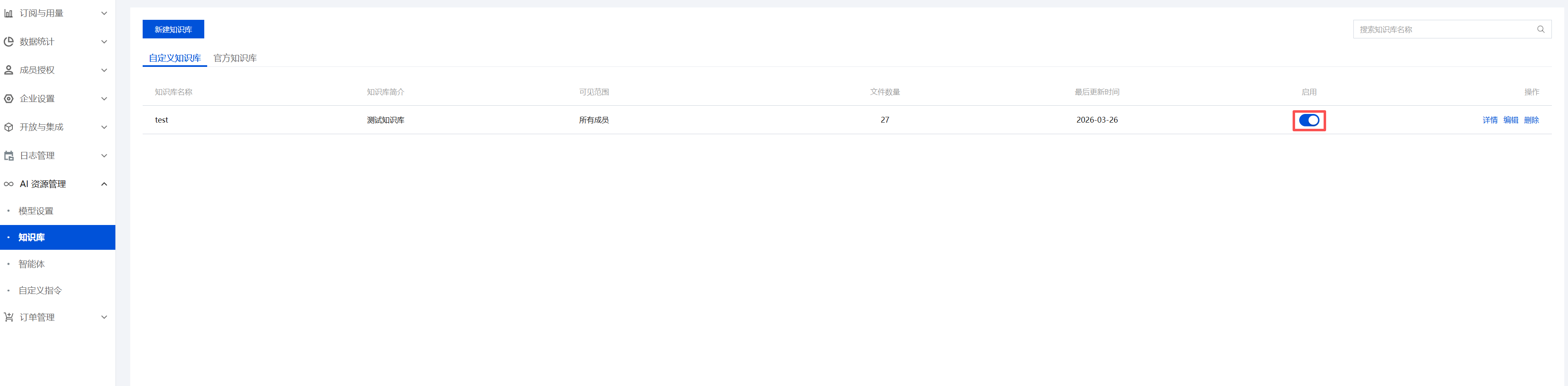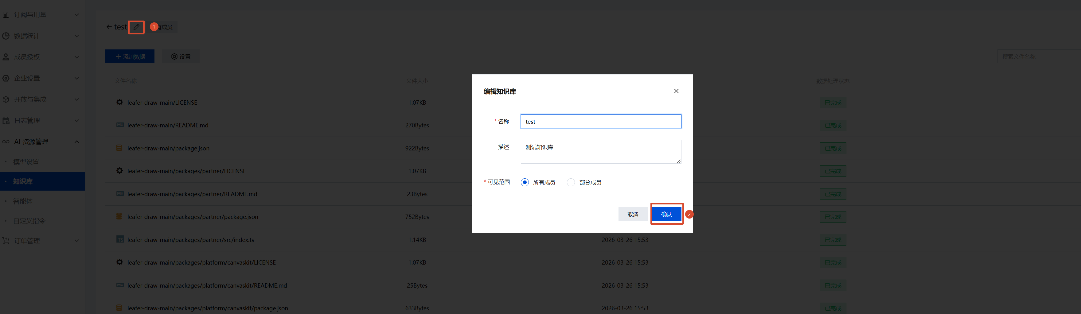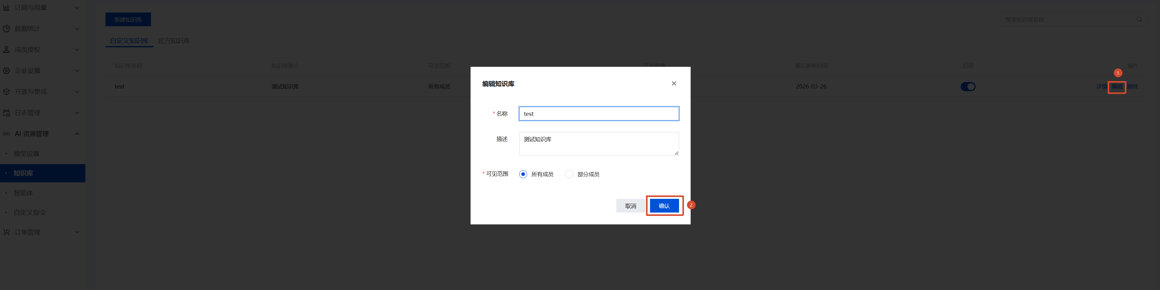 从知识库列表编辑:在知识库列表中选择对应知识库,单击编辑,即可进入知识库编辑模式。