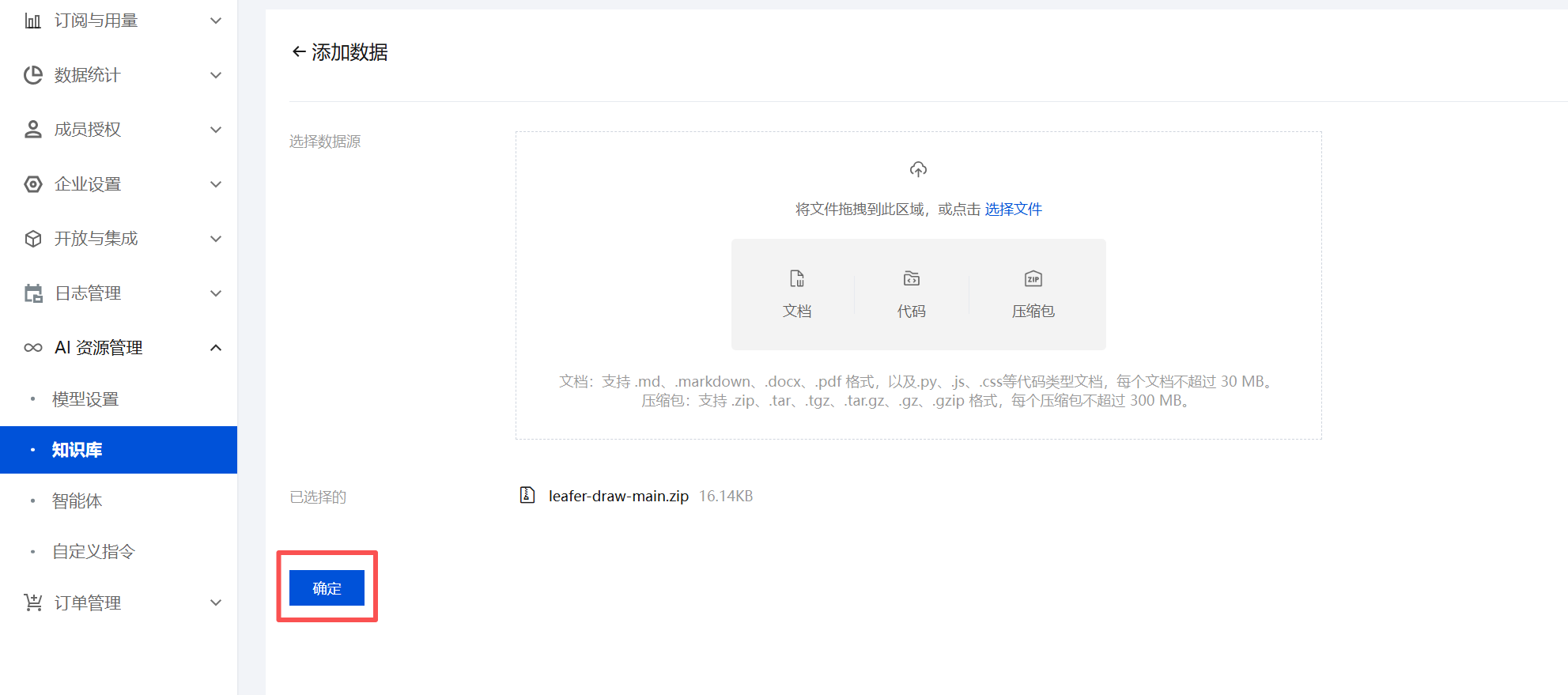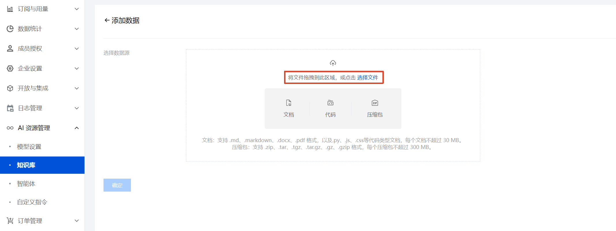 文档:支持 .md、.markdown、.docx、.pdf 格式,以及.py、.js、.css 等代码类型文档,每个文档不超过 30 MB。