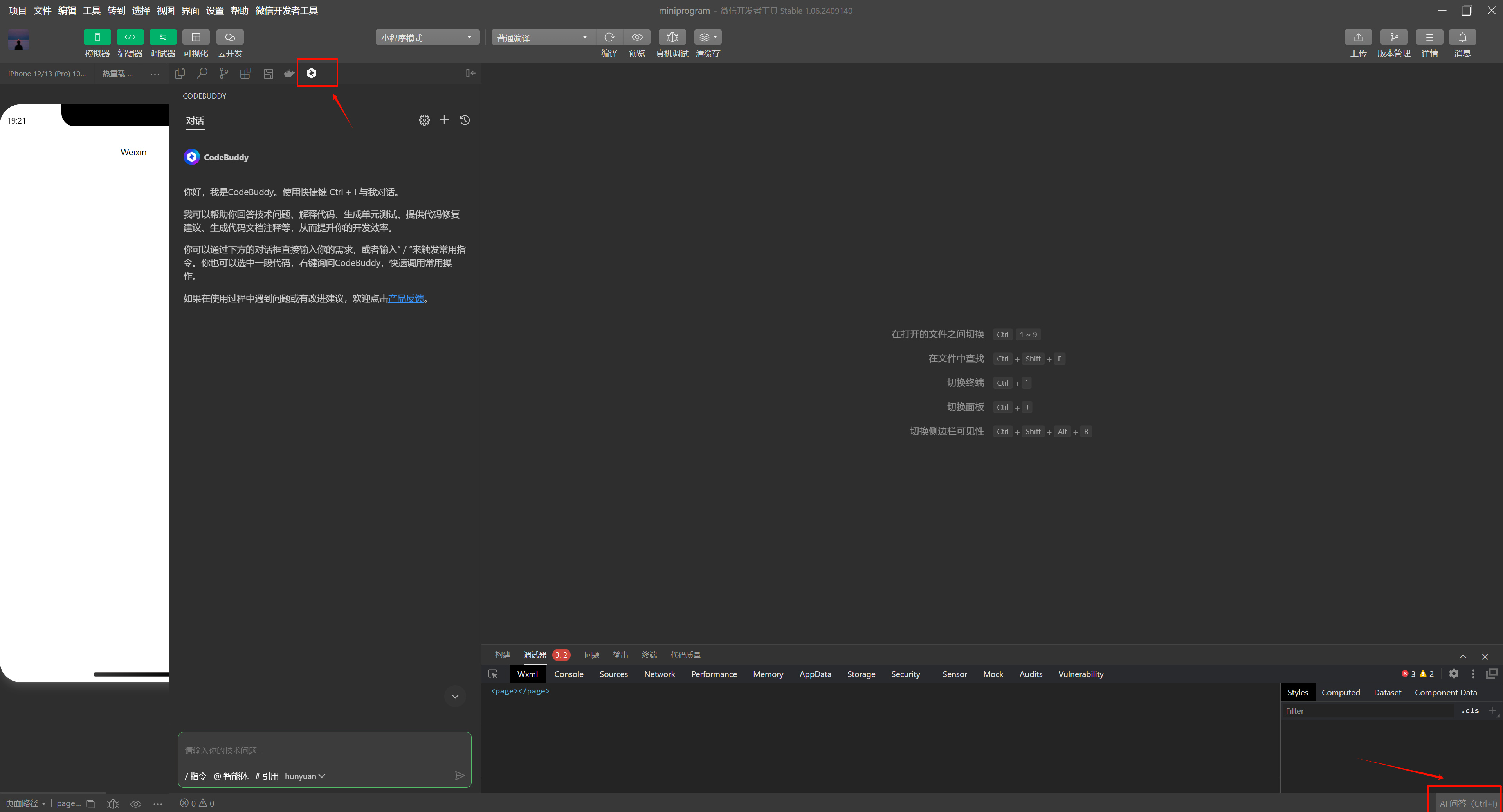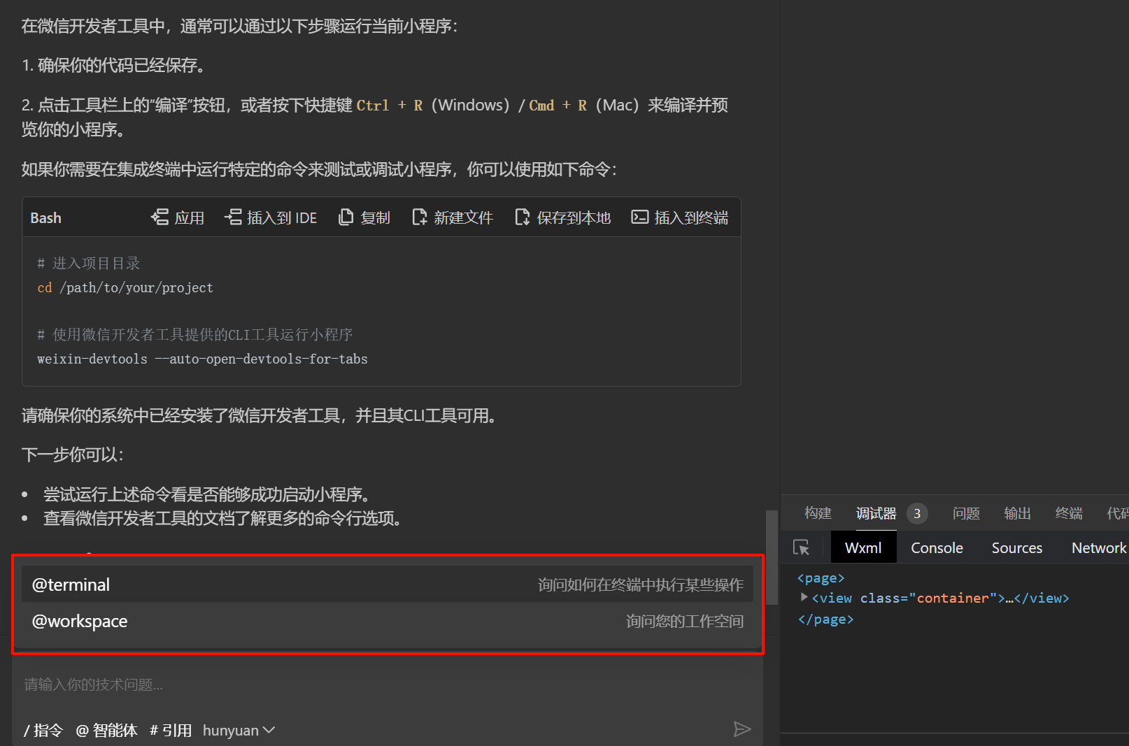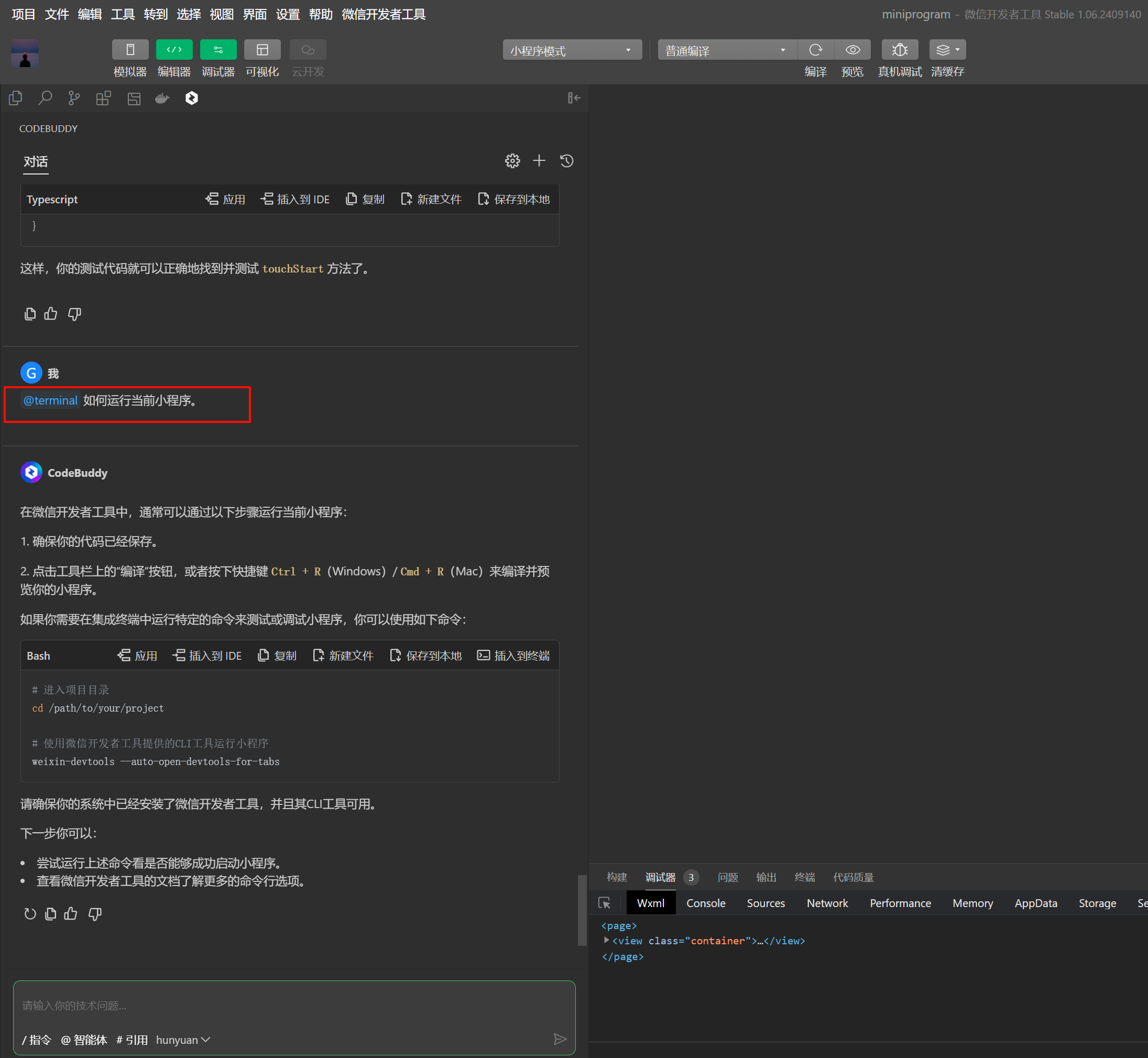 腾讯云代码助手的技术对话功能,与微信开发者 IDE 做了深度的融合,并享用和 VSCode 一致的交互操作。