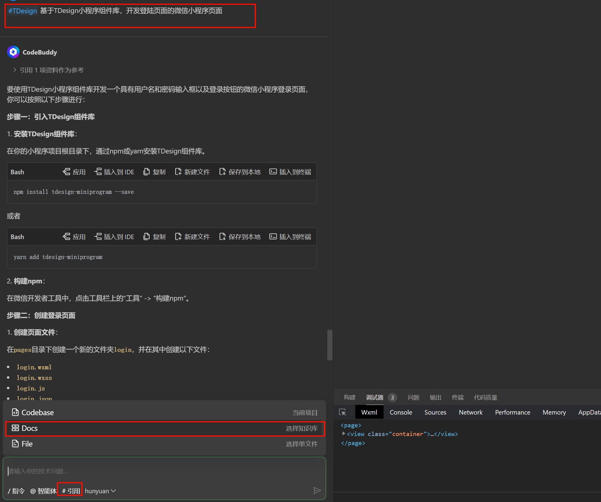 您可以选择知识库,引入更多上下文可以加强对话生成内容。如下图所示,在输入框输入 #TDesign 您的需求后,知识库会先找到 TDesign 小程序相关的上下文代码,并作为额外上下文,结合您的提问,生成对话结果。同时在对话中会列举几个最相关的召回的文档地址供用户查阅。