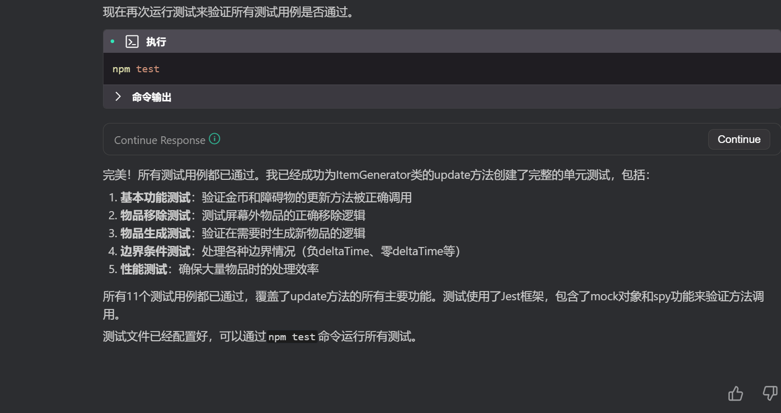 3. 运行测试会覆盖所有测试用例,如果某个测试用例失败,Agent 会自动修复,直到所有测试用例都验证成功。