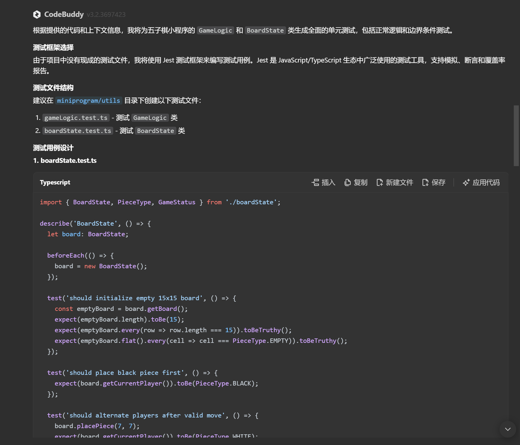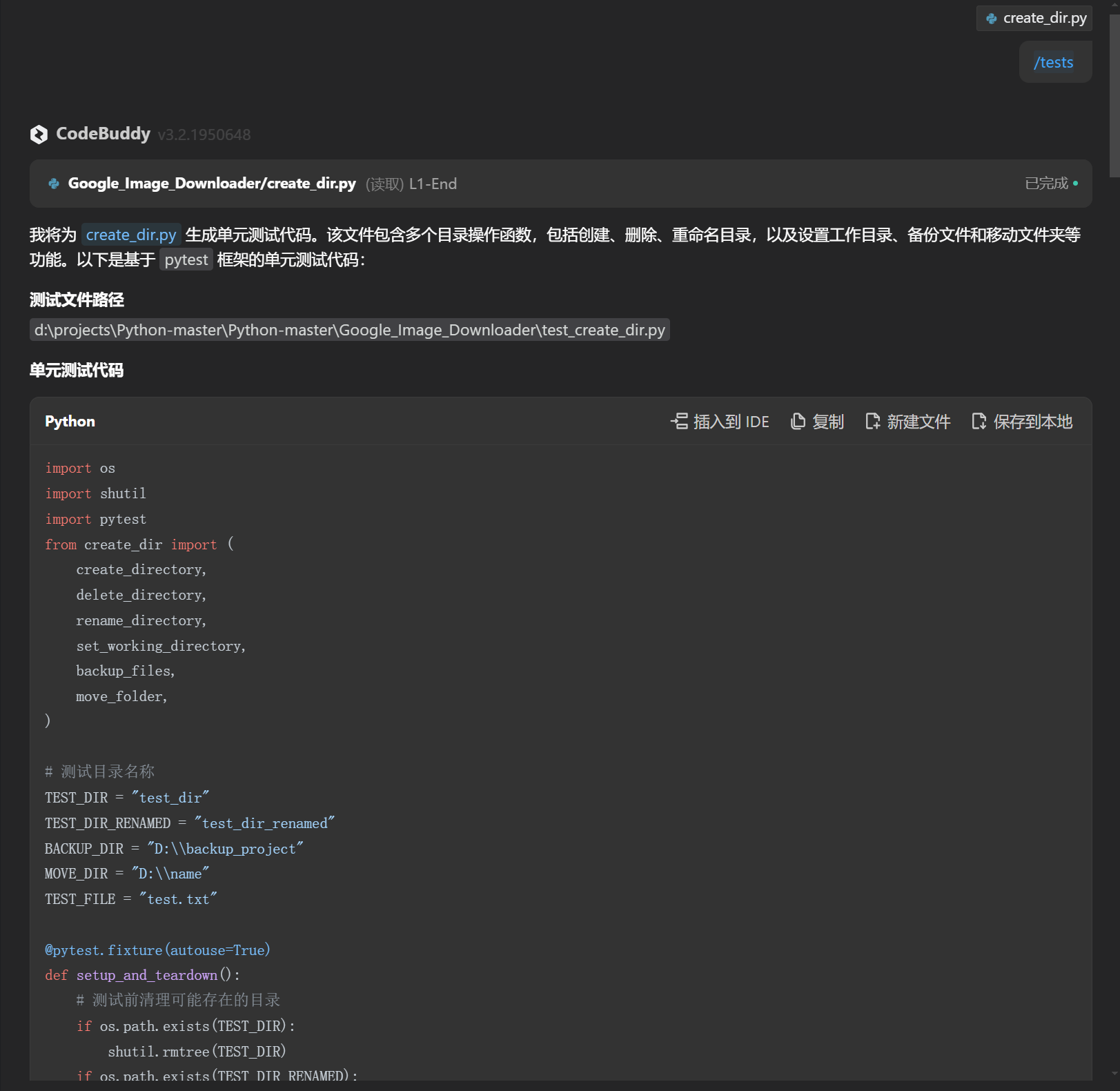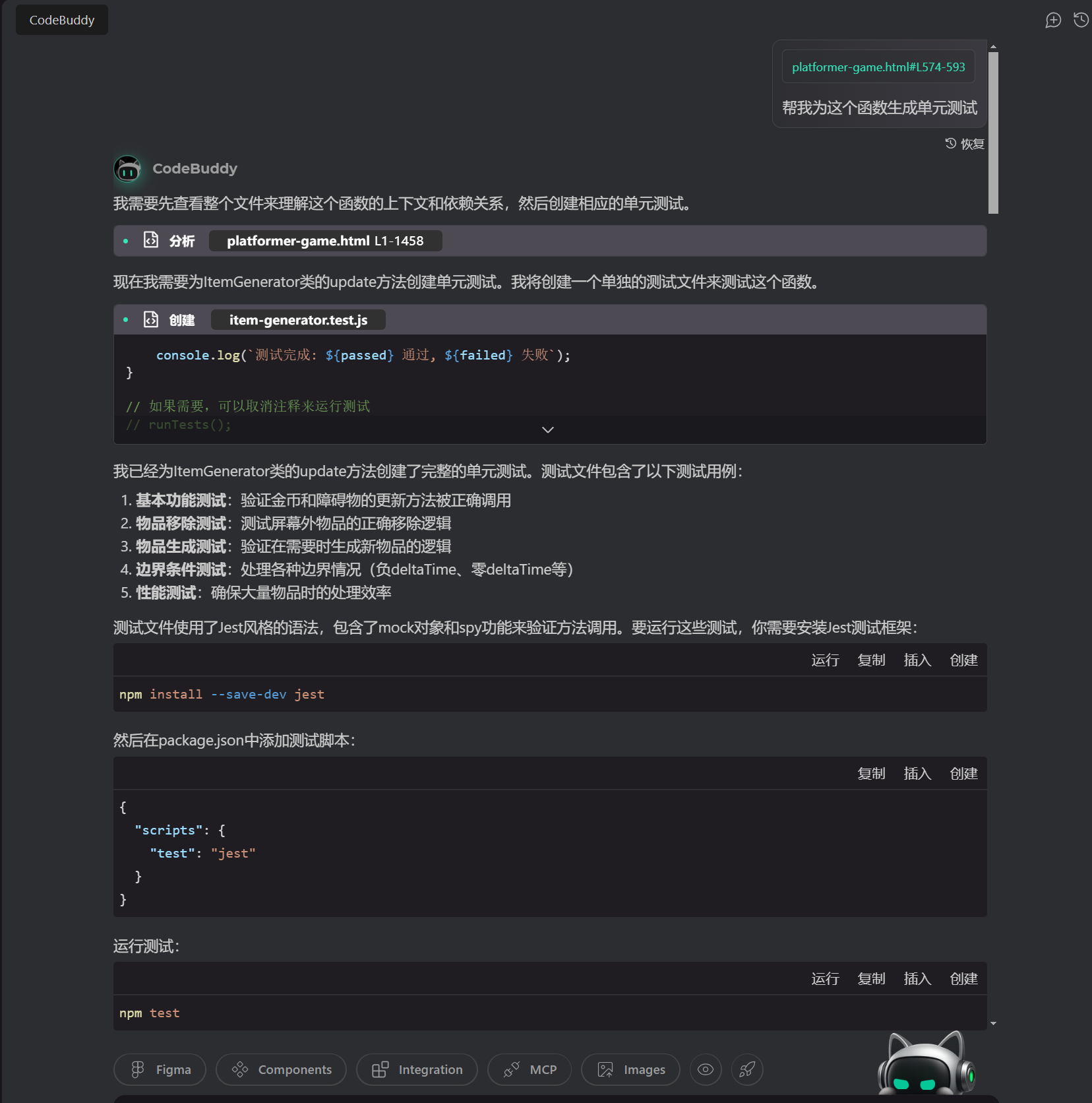 1. 触发单元测试生成后,代码助手会先对测试代码内容进行分析,并选择合适的测试框架生成单元测试代码。同时,也生成了测试说明、运行测试指令等内容,辅助进行测试。