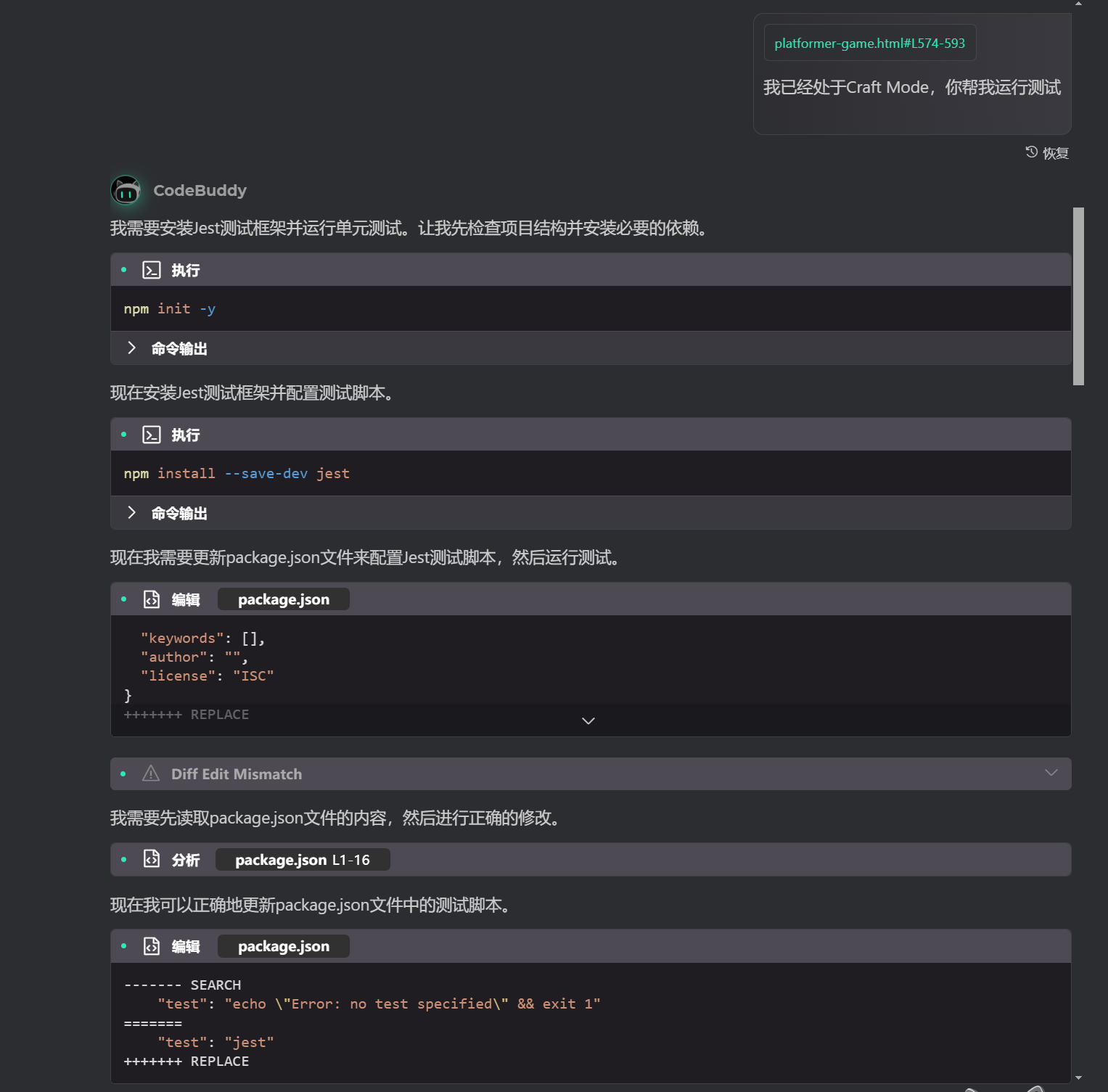 2. 创建单元测试后,如果希望 Agent 自动运行测试,可以提醒 Agent,Agent 将会自动安装测试框架、配置测试脚本、运行测试。